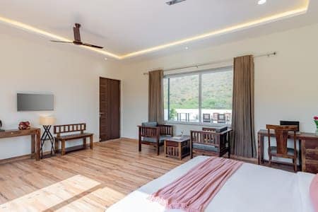"Hidden Haven, in Udaipur, is a luxurious escape blending modern comforts with nature's serenity. The private pool beckons relaxation amid lush greenery. The farmhouse, seamlessly integrated with its surroundings, offers panoramic mountain views. Monsoon evenings or winter nights with Cozy fireplaces and starlit evenings make every moment memorable. Discover a tranquil sanctuary, where luxury and nature converge for an unforgettable retreat."