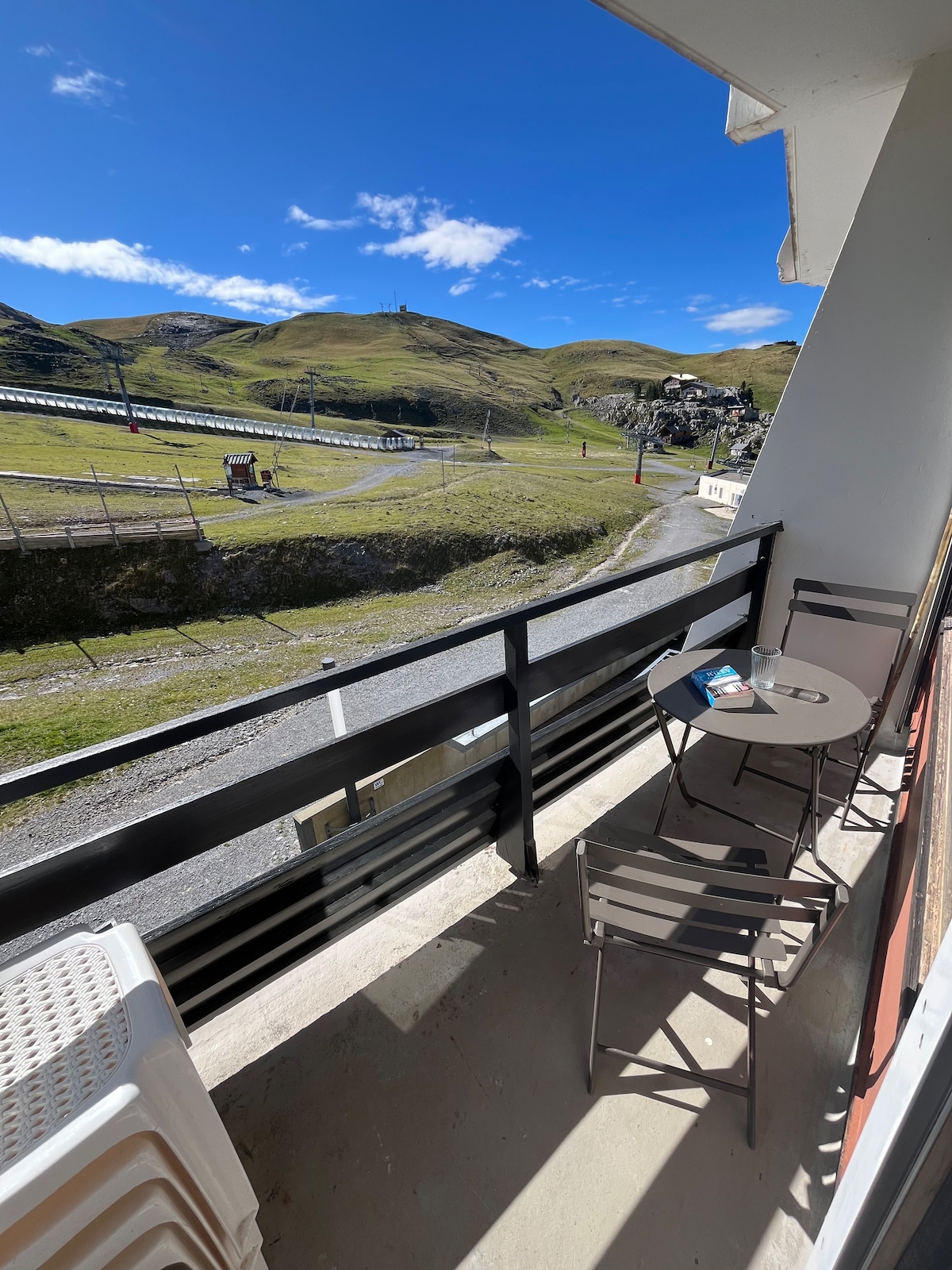 Appartement avec balcon et superbe vue pistes. Accès direct à la galerie marchande et aux pistes par ascenseur, tout à pied et proximité GR10. 23m2 cocooning idéal pour 2 adultes et 2 enfants (ou 4 adultes), situé dans la résidence Super Arlas 4ème étage. Agréable pièce de vie avec cuisine, TV, micro ondes et plaques de cuisson, frigo, cafetière filtre, appareils raclette et fondue. Une banquette lit 160 + 2 lits 90. Couvertures et oreillers fournis. Local à skis.