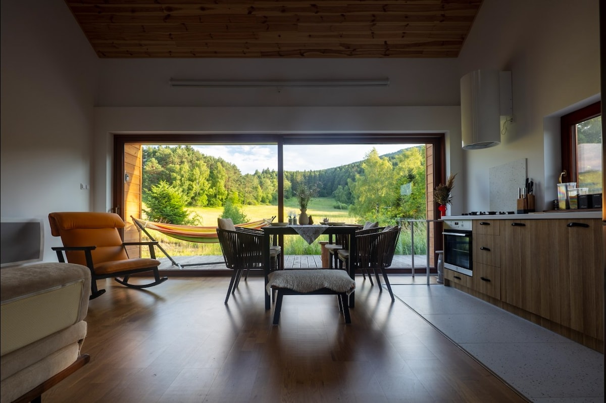 Zapraszam do Chabrowa, domu nad jeziorem Klimkówka, otoczonego lasami i wzgórzami Beskidu Niskiego. Dom wybudowany jest w zgodzie z naturą (elewacja ze starego drzewa, świerkowe i dębowe podłogi wewnątrz) oddany do użytku gości w listopadzie 2022. Wygodna przestrzeń (220m2 + taras 70 m2) dla max 10 osób. Chabrowo to również przestrzeń na warsztaty (jogi lub różnego typu kursy). W okolicy nie ma sąsiadów. Jedynymi sąsiadami są jelenie, które często przychodzą na polanę tuż przed domem.