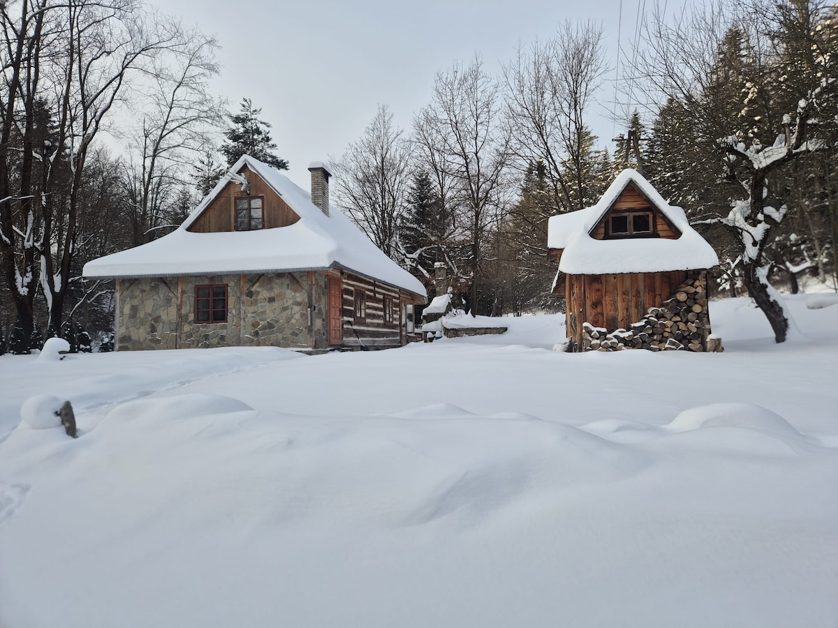 Domek zdala od zgiełku, w sercu beskidzkiej natury. ​Na antresoli duże łóżko, a w salonie rozkładana sofa (sypialnie nie są oddzielone), dobrze wyposażona kuchnia, podgrzewana toaleta, projektor na wieczory filmowe, internet światłowodowy, hamak, grill, palenisko, a w zimie sanki :) Zapewniamy błogą ciszę oraz niezapomniane gwiazdy, jeśli pogoda pozwoli. ​Szlak niebieski 100m od domku, Ostry Wierch 15-25 min pod górę przez las. Dojazd zimą tylko z łańcuchami. Atut - brak zasięgu sieci kom. :)