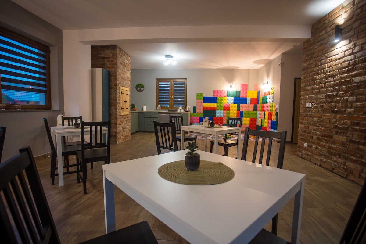 Luksusowy obiekt, gdzie wspólnie z rodziną i przyjaciółmi przeżyjesz niezapomniane chwile. Ustronna lokalizacja, na łonie natury pozwoli oderwać się od zgiełku codzienności. Poza nietuzinkowym designem domku, oferujemy naszym gościom szereg urozmaiceń. W trakcie gdy twoje dziecko bawi się na naszym placu zabaw, ty możesz zrelaksować się w saunie i jacuzzi. Nasi goście mają również możliwość skorzystania z grilla, którego mogą rozpalić przy przestrzennym tarasie.