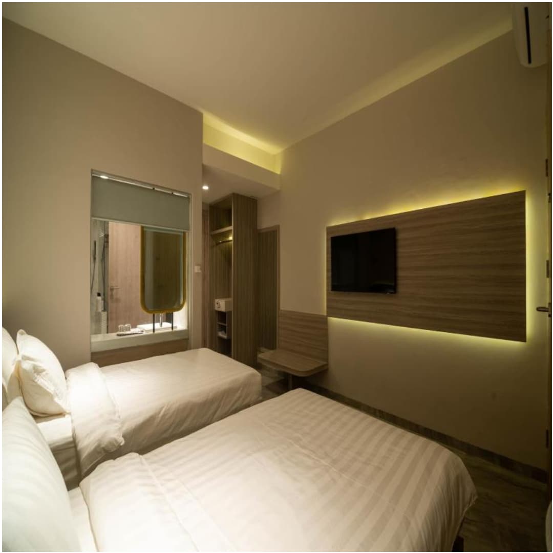 Kamar Double atau Twin 1 kamar dengan kamar mandi bersama 16 m² Balkon Pemandangan landmark AC Patio Teras Wi-Fi gratis Ukuran 16 m² 1 singledan1 double besar Tempat tidur nyaman, This air-conditioned twin/double room features a shared bathroom, a private entrance, a seating area as well as a terrace. The unit offers 2 beds.