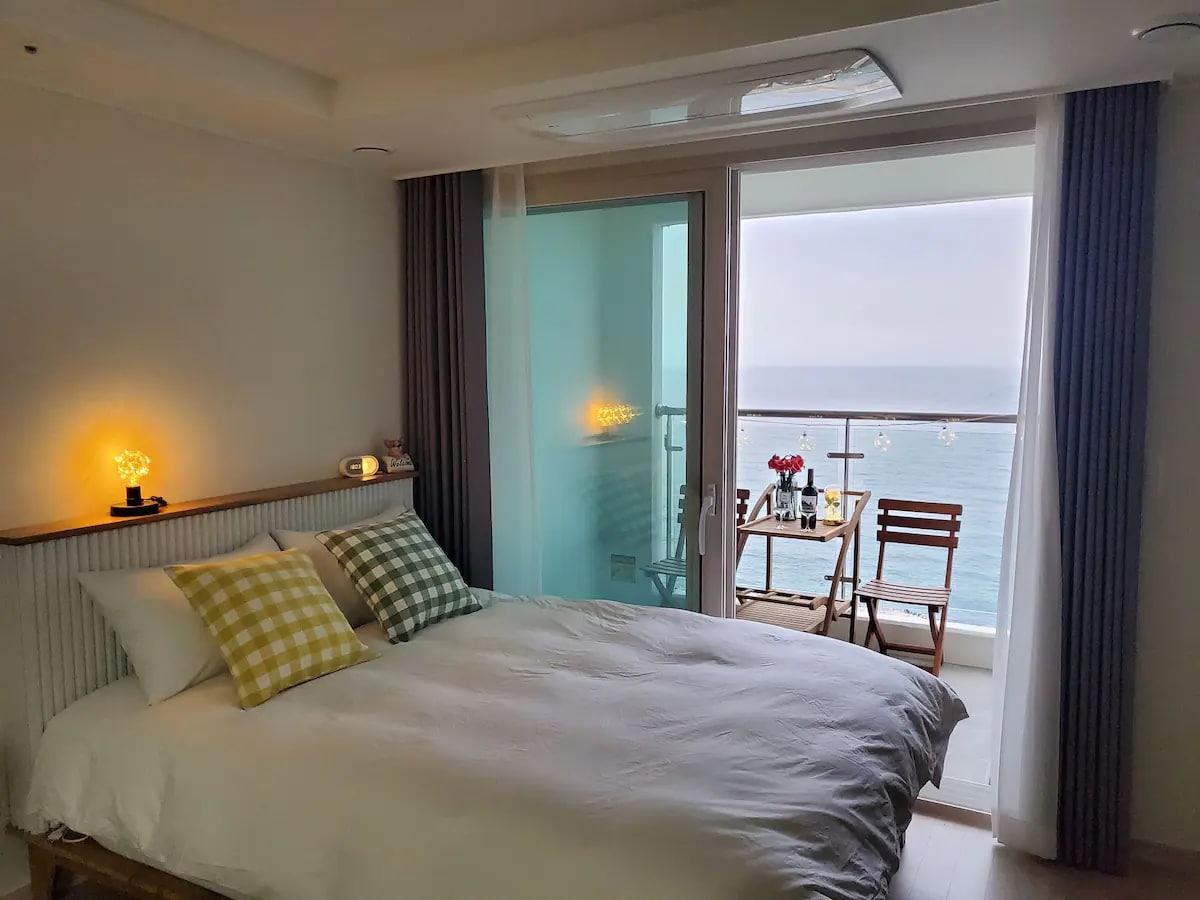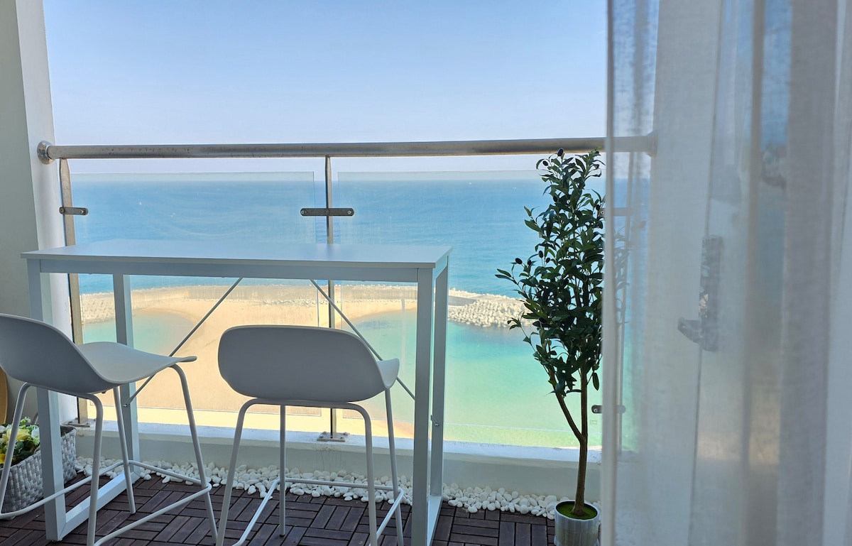 2023 Grand opening, E7 in Jukdo. -One Studio Room (Double bed) -Just in front of Dongsan Beach, 10Sec from the Beach -Check In from PM4:00 -Check Out by AM11:00 -3Min by car from Jukdo Beach, Ingu Beach -15Min by car from Jumunjin Beach, BTS MV location -30Min by car from Kyungpo Beach, Sok-Cho and Seolak Mountain. -Refrigerator, Electric range, Microwave, Dishware, Pot, Frying pan -Shampoo, Hair conditioner, Body shampoo, Tower Thank you:)
