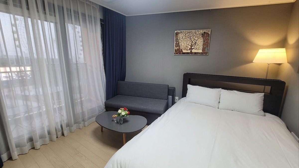 뷰가 최고인 호텔 11층 주니어스위트 1.5룸(35m") 크기의 침실과 거실 겸 주방이 분리되어 있는 객실로 산과 바다와 호수의 뷰를 동시에 감상할 수 있어요. 2020년 1월 신축 호텔로 시내 중심가에 위치해 있어 주변 200m에 속초관광수산시장 , 갯배, 아바이마을, 동명항, 속초항, 등대, 속초해수욕장, 청초호 등 관광명소와 유명 맛집, 그리고 편리한 교통, 무료 주차, 전기차 충전소 등 편의시설을 갖추고 있어요. 객실 역시 힐링하실 수 있도록 운영자가 직접 관리하고 있어 매우 깨끗하고 모던합니다.