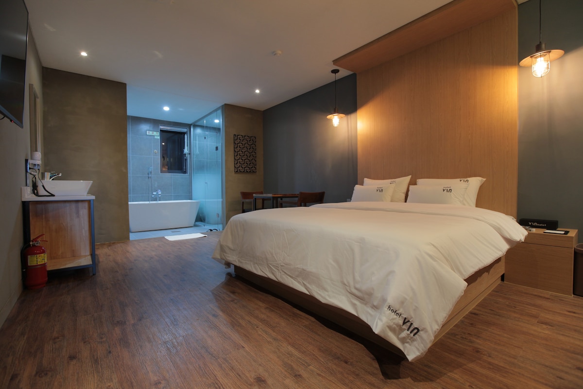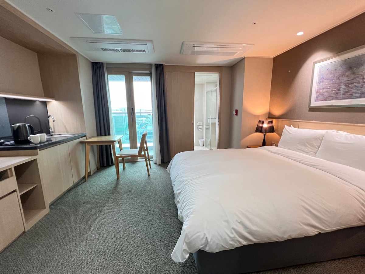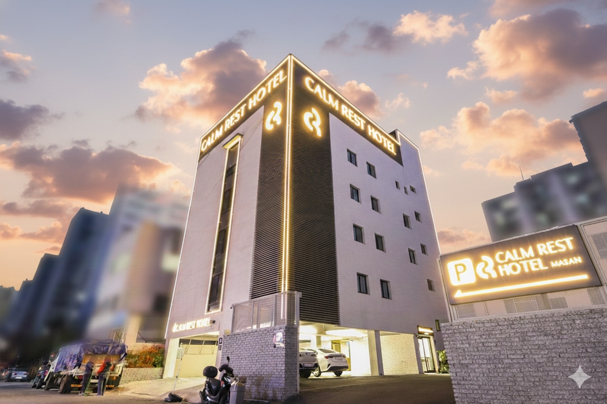 킹사이즈 침대+욕실로 구성된 객실입니다.쾌적한 환경, 넓은 주차장을 자랑합니다. 조각공원이 같이 있어 산책하기 매우 좋습니다. 마산중심지에 위치해 있어 교통이 편리하고 진해해상공원, 벚꽃축제 및 마산어시장, 야구장 등 주요관광지와 관공서 및 기업 등 주요 업무시설에 접근성이 매우 좋습니다. 접근성과 스타일을 모두 갖춘 숙소입니다.