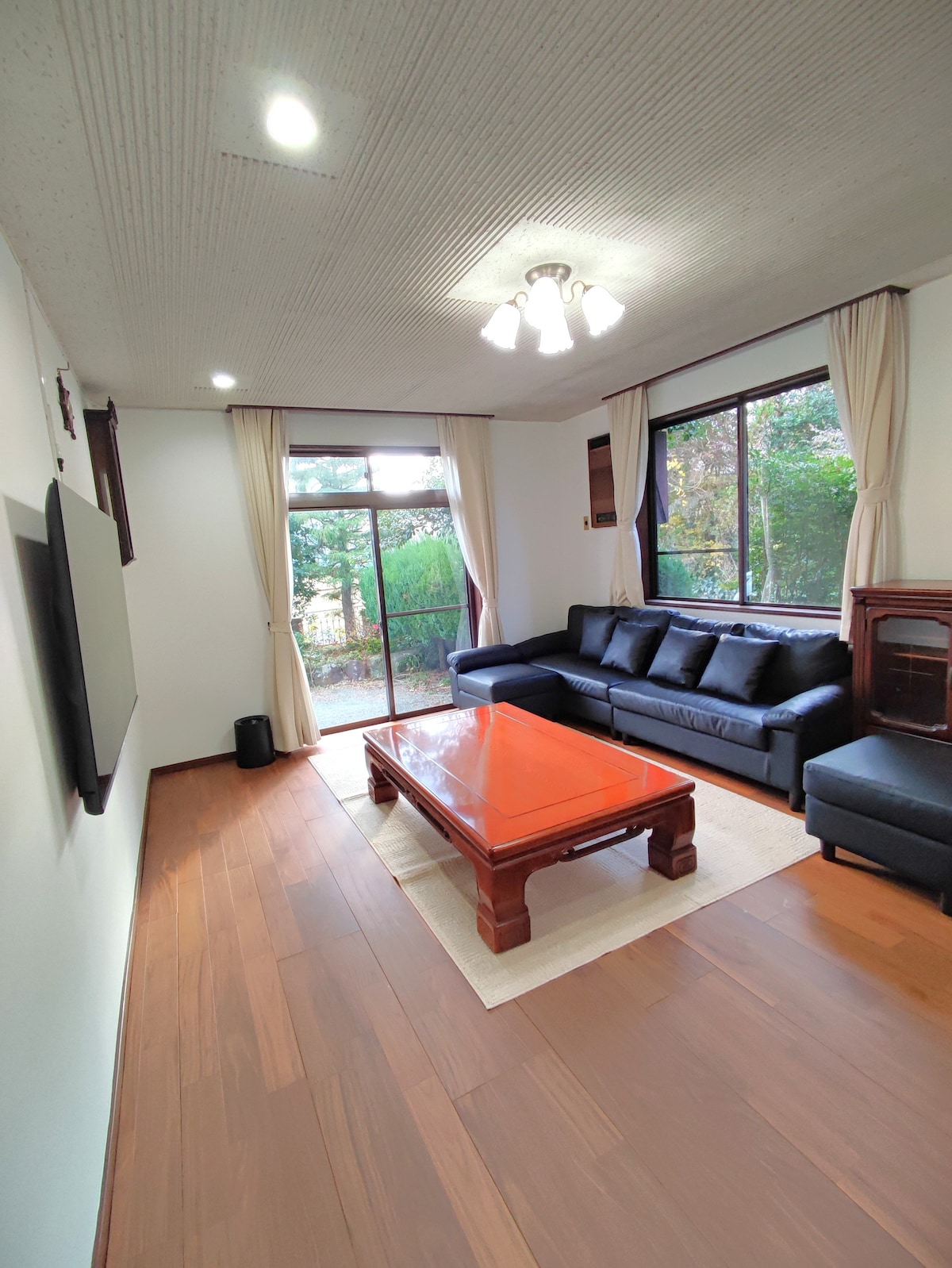 2024年7月にデザイナーによるリフォームをした、山中湖から徒歩11分の別荘地にある 「プライベートリゾート 富士」 という一日一組限定の宿です。 延床面積115㎡、3LDK のログハウスを基調とした和モダンデザイン一軒家で、 2階にあがると、リビングの窓から大きな富士山を望むことができ、富士山をバックに大きなバルコニーでBBQをしたり、木々に囲まれたバレルサウナを満喫した後には、そのまま外の休憩スペースで森林浴をしたりと、していただけます。庭には、大きな焚き火台があり、火を囲んで語らうこともできます。また、庭には高めの柵を設置しているため、愛犬を連れてきても逃げてしまう心配はございません。 部屋には90インチの大型スクリーンがあり、Prime Video、Youtube などが楽しめます。夜には、条件が良ければ満天の星空も見ることができます。