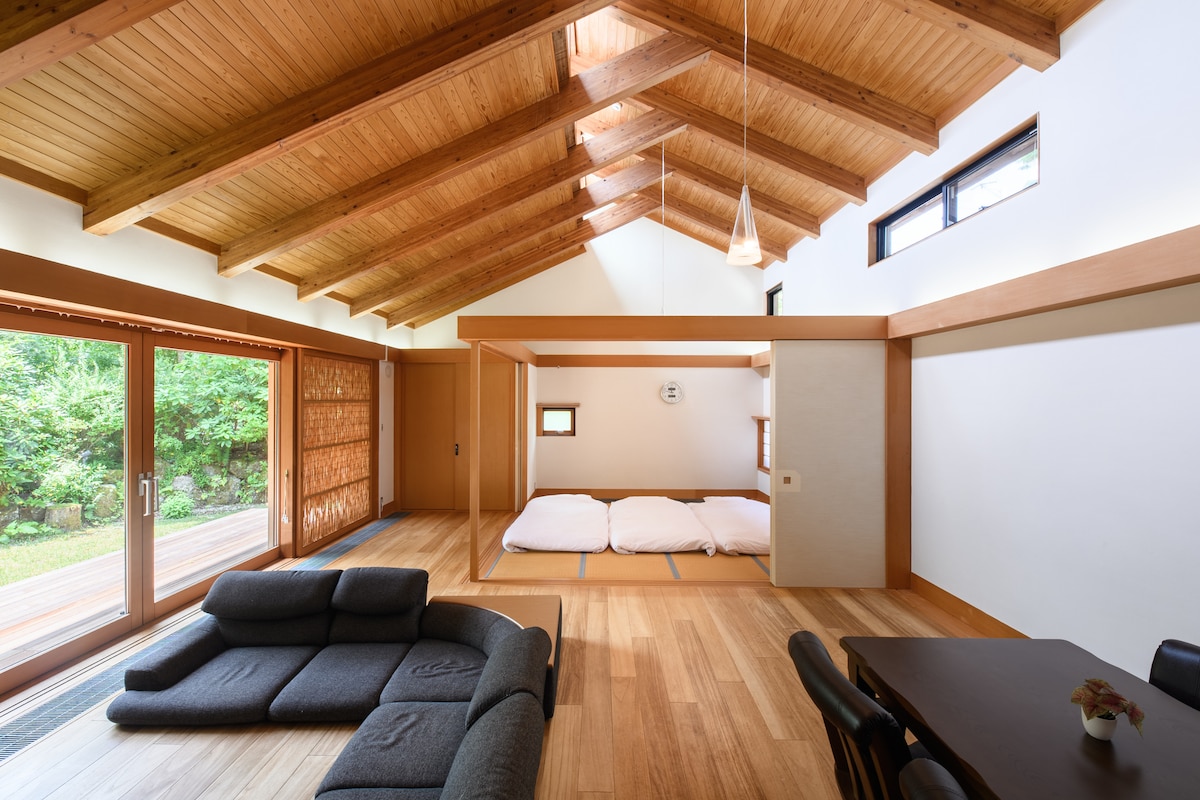 Rent this whole house, with Private Hot springs! New built on 2022 autumn, for comfortable staying of Airbnb guests! 100% natural flow of fresh hot spring, it is available on 24 hours for your group only. 5min walking away from a convenience store and 6min to a bus stop(Directly access from HanedaAirport!) Bed is traditional style of Japanese Tatami. Kitchen is fully installed and you can enjoy BBQ on the outside garden area. Bicycles are provided(NEW!) Suite for one or two families!