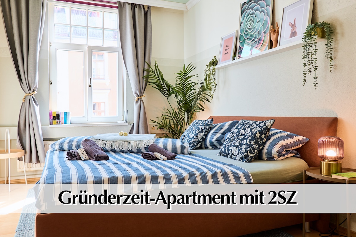 In unserer wunderschönen Gründerzeitvilla haben wir eine separate großzügige Wohnung für unsere Gäste reserviert. Ruhig gelegen und trotzdem zentrums-nah. Schnelles Internet über WLAN verfügbar. Außerdem haben Sie eine private Dachterrasse und können nach persönlicher Absprache unseren Garten mit nutzen. Parkplatz vor dem Haus vorhanden.Das historische Haus entführt dich in eine Zeit der Entspannung und entschleunigt deine Auszeit!