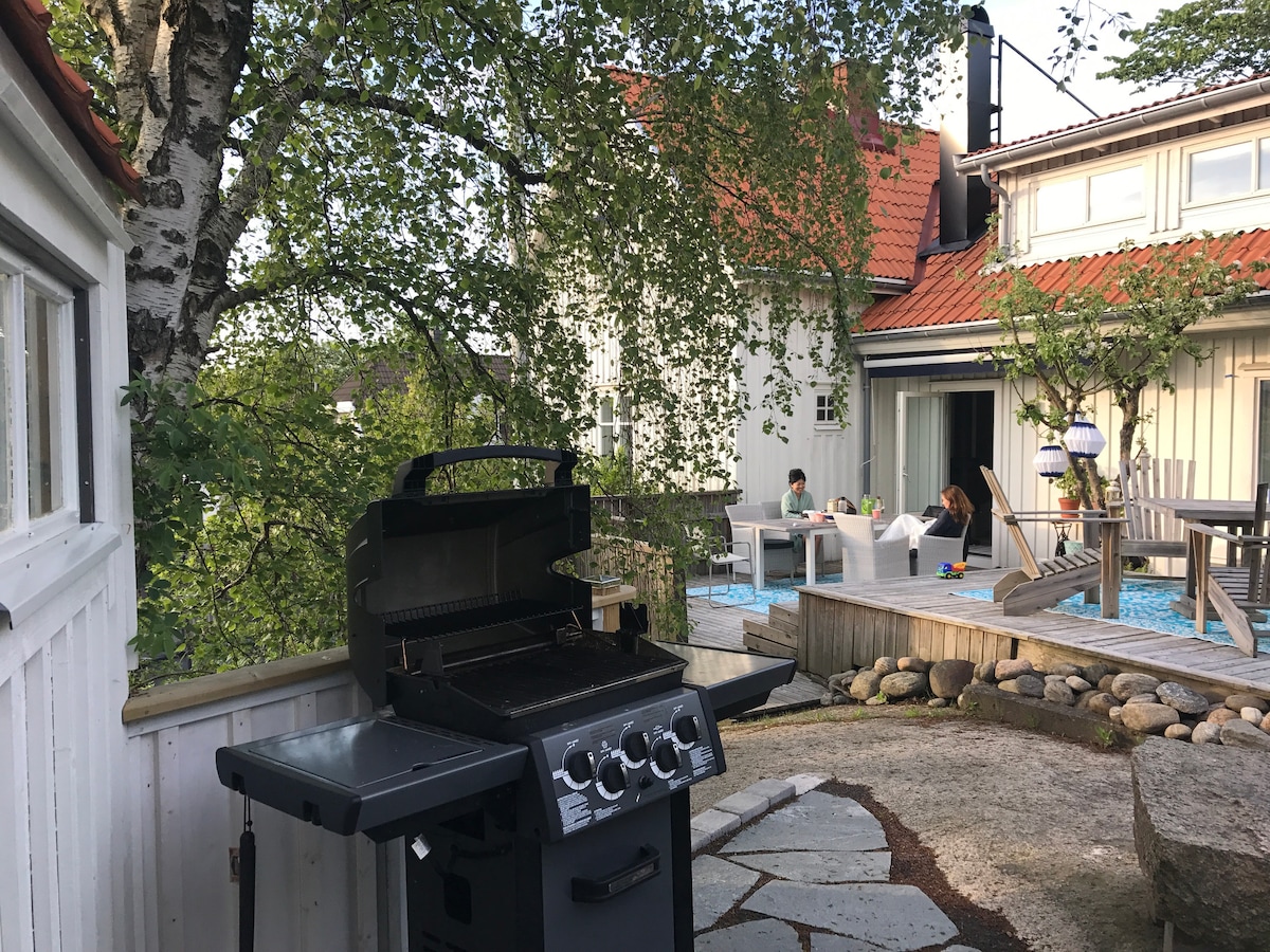 Cozy cottage in very nice area right by the sea. Quiet and nice with sun all day. Lovely large patio with larger table and BBQ for wining and dining. In addition, own private terrace with deck chairs. Only 2 minutes walk to tram taking you directly into town in 20 minutes. Or take the tram 2 stops to nearby Saltholmen and take the ferries to the lovely southern archipelago.