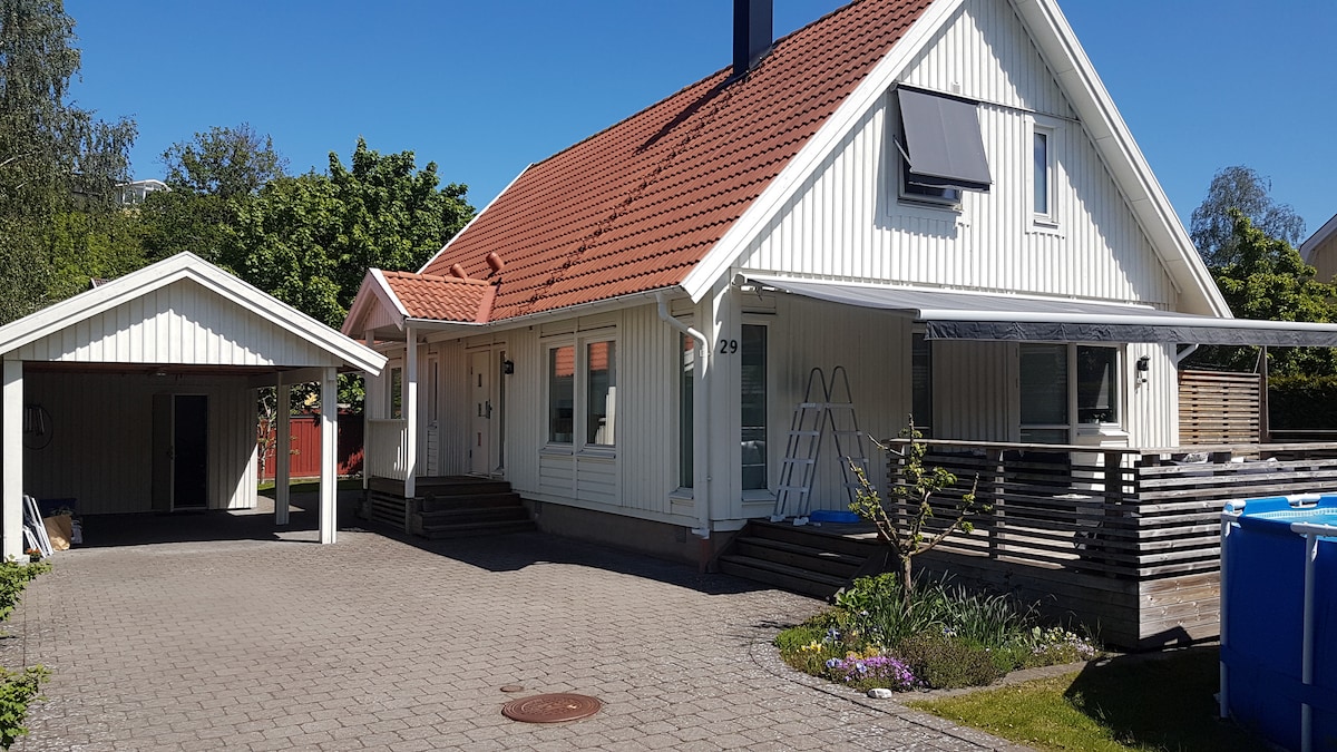 Enjoy the closeness to the sea, the nature and the city of Gothenburg (and Swedens oldest golf course)! Beautiful and charming but modern house with a lovely location; 300 m from the sea and with no close neighbours. A big terrass behind the house, close to a big field. Pool (4x9 m), available May-August (maybe September) and a jacuzzi with room for 7 people. A nice balcony where you can enjoy the evening sun and the silence. Don't hesitate to ask about other dates than the available ones!