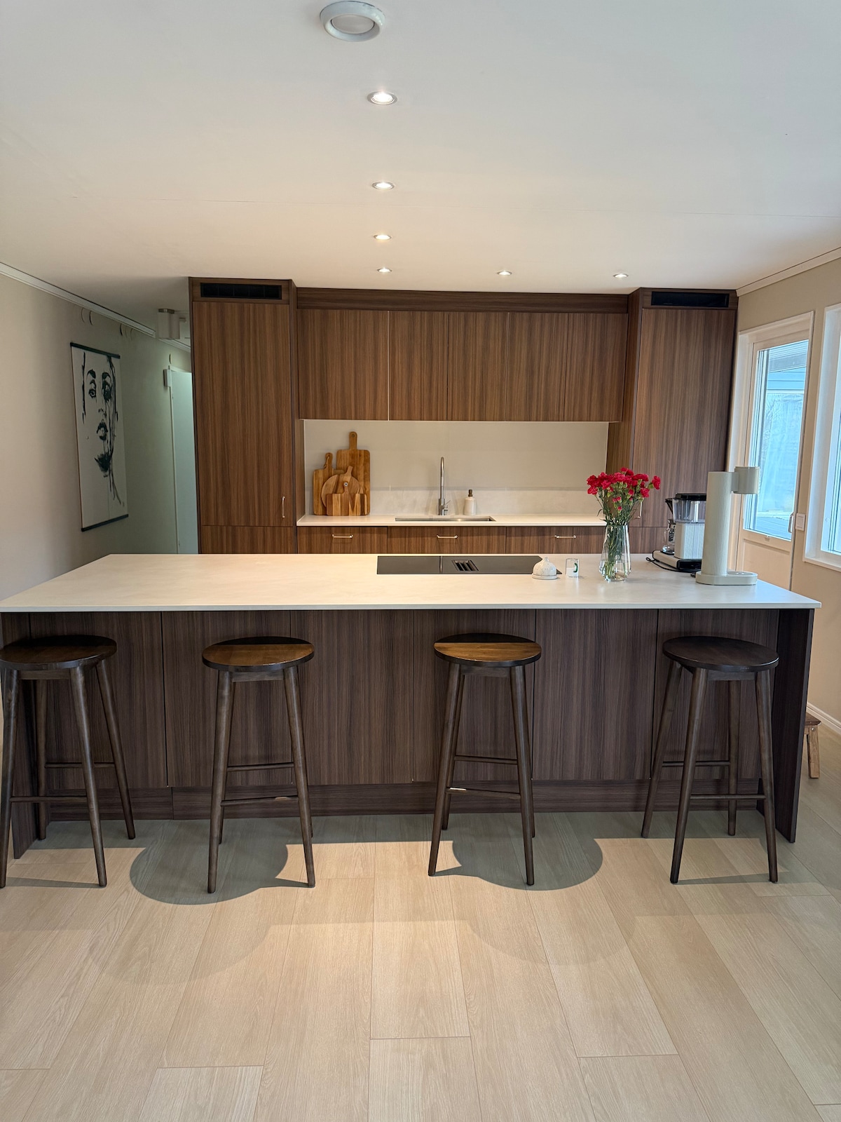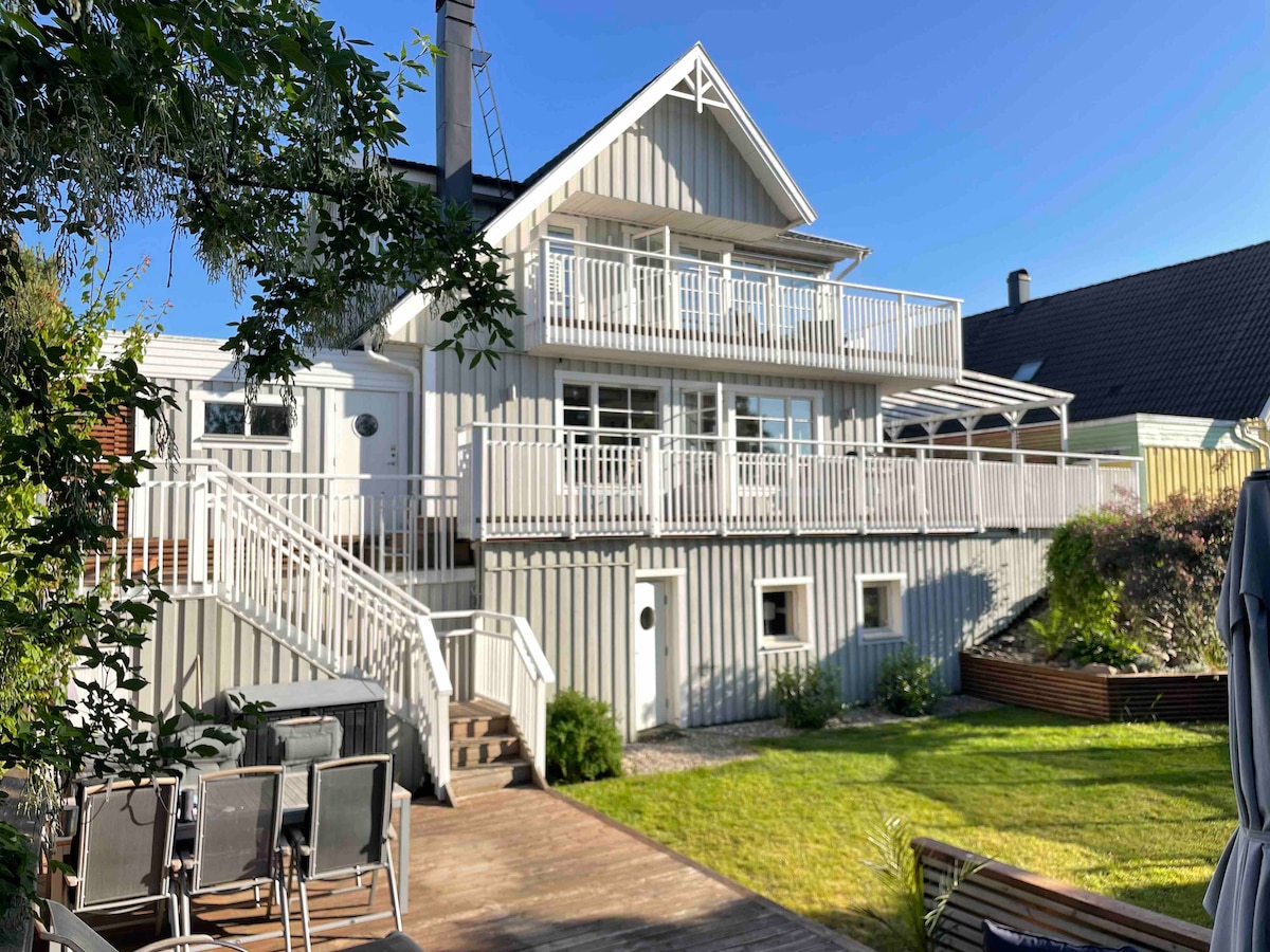 Modern oas nära havet och Göteborgs skärgård. Nyrenoverat radhus på 2 våningar, 200 kvm. Endast 5 min till havet 🚗 och 10 min till centrum med direktbuss 🚌 (hållplats 2 min bort). Solläge från morgon till kväll, två nyrenoverade badrum varav ett med bastu. Modernt, öppet kök med stor köksö och vinkyl & bubbelvatten. Stor terrass med utekök med grill & kokplatta & eldstad. 75 tum tv med PS5. Mataffär nära. Extra madrass kan läggas till vid förfrågan. Leksaker finns att låna, Lekplats 1 min bort