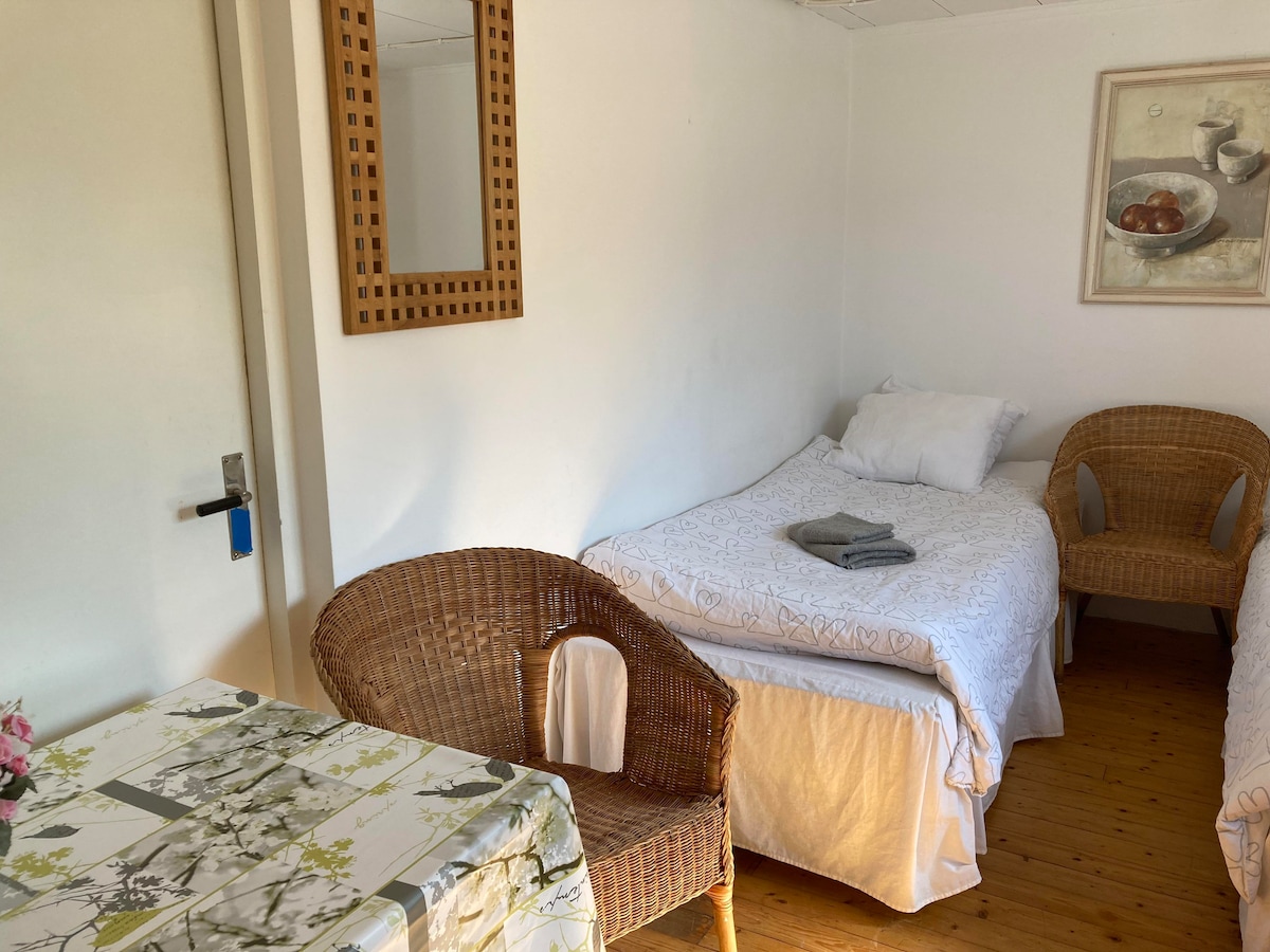 Välkommen till vårt charmiga guest house med en hel del extra och skogen inpå knuten. Ett ljust sovrum med dubbelsäng, sovloft för extrasäng och generöst badrum med dusch och härlig bastu för vintersäsongen. Egen terrass för såväl frukost i morgonsolen, som en slapp stund i en solsäng. Frukost inkluderar bla färska ägg från egna höns – som också ser till att ingen försover sig på morgonen. En fantastisk plats för själen, oändliga strövområden och bara 25 min till pulsen i centrala Gbg.