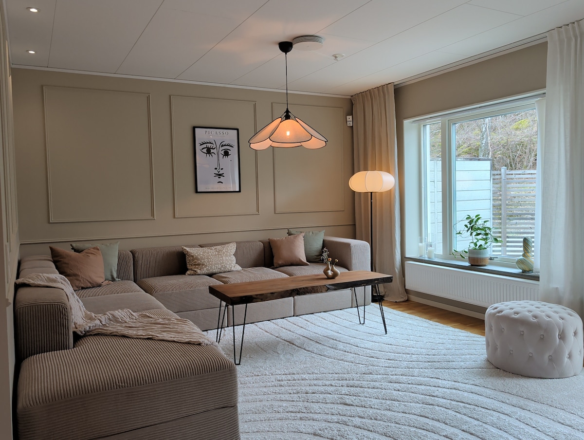 Optimalt boende md 7-8 ”riktiga” sängplatser men plats för fler personer på soffor o madrasser. 4 platser på soffor, men gott om plats för madrasser. Hus 160 kvm Även HANDIKAPPANPASSAT och funkar för rullstol. 3 km till närmsta havsbad i Tumlehed. Knapp 100 meter till busshållsplats som med direktbuss in till Göteborg. Det tar ca 30 min. 20 minuter med bil in till Göteborg centrum. 700 meter till närmsta bra mataffär. Willys. 2 km till större köpcentra, bra restauranger mm. Elstolpe fri