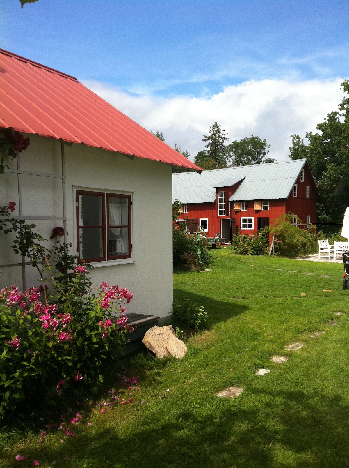 Typical Swedish red wooden house from the early 20th century, fully refurbished to a modern standard. Two bedrooms in the attic are accessed by a steep staircase. Downstairs is a living room with two sofas (of which one is a sofa bed) and a rocking chair. TV, Chromecast, and fireplace. Kitchen with fridge and a small freezer, gas stove, oven, micro oven, and fireplace. Dining area seating max 8 persons. Large garden of 5000 m2 including a sauna.