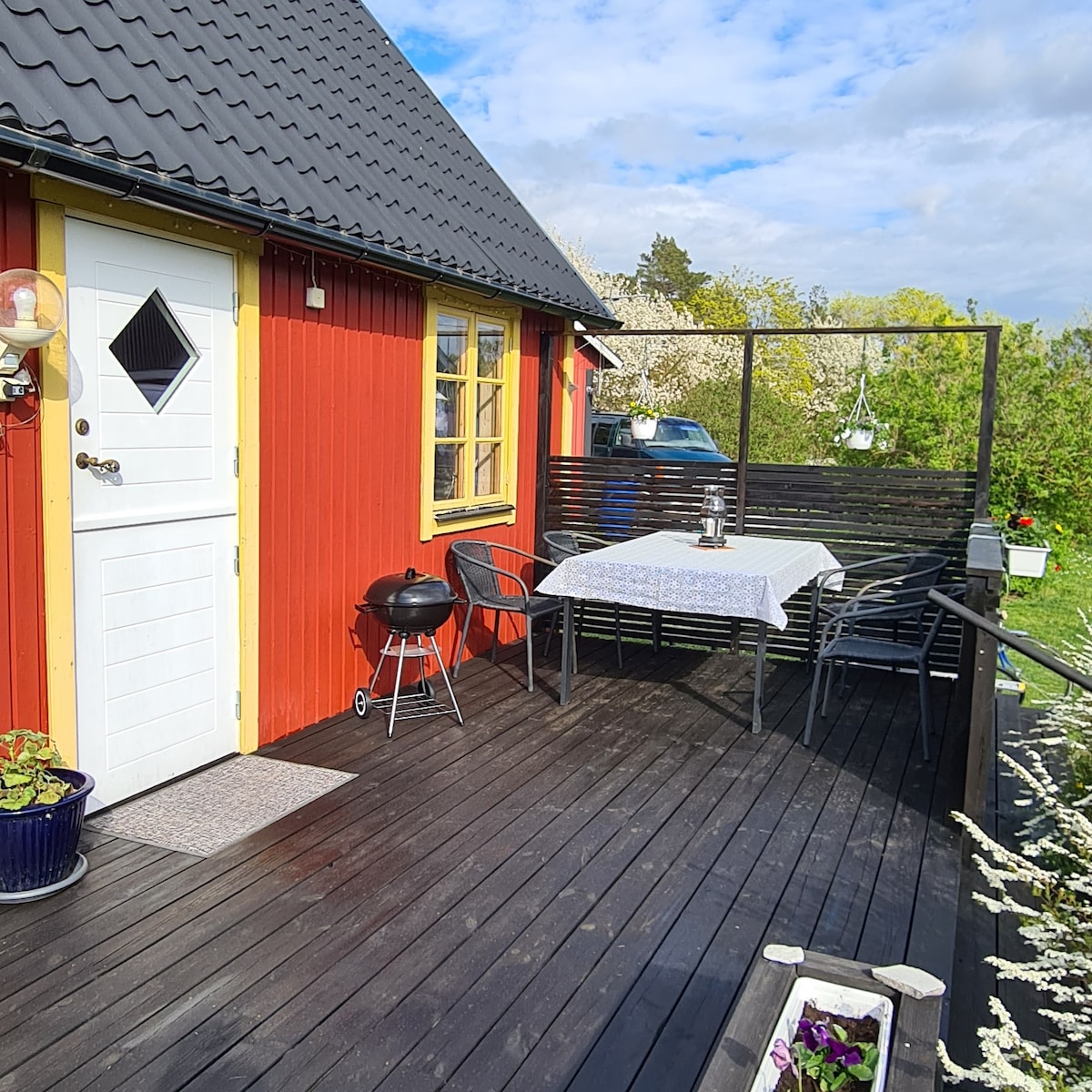 Her vil I bo! Frisk og veludstyret lille feriebolig i naturskønne omgivelser, 5 km syd for Visby. Ideel til et afslappende ophold for 2 voksne og 2 børn. På 1 sal er der to senge (80x200 cm), og i stuen findes en sovesofa (udslået 180x200 cm). Der er skærme med HDMI-kabel på begge etager. Tæt på havet med smukke solnedgange. Gåafstand til Prinsesse Eugénies Fridhem, Kneippbyn og naturreservaterne Högklint og Kuse änge. Røgfrit og husdyr ikke tilladt. Hyggelig gårdhave med grill.