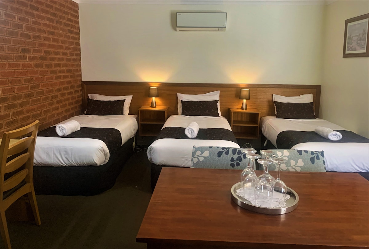 Family room with with options for bed configurations from Queen to Singles let us know Heathcote is one of Victoria's premier wine regions with many luxurious wineries and prime breweries, complimented by beautiful scenery and local attractions, that attract people from all of the country.Warm friendly accommodation with a well stocked bar of top shelf spirits, local and craft wines and beers, Heathcote Inn "its a county thing"We will help you arrange local tours and recommend local sites to visit.Air conditioning and Heating, TV Bar Fridge and Tea Coffee making facilities. Toaster and Continental breakfast provided to each room daily. We have an onsite restaurant and coffee shop for guests with well priced light meals and snacks. Hours can be found in guest book in room. We have a full access room, cots for the little ones and plenty of parking.