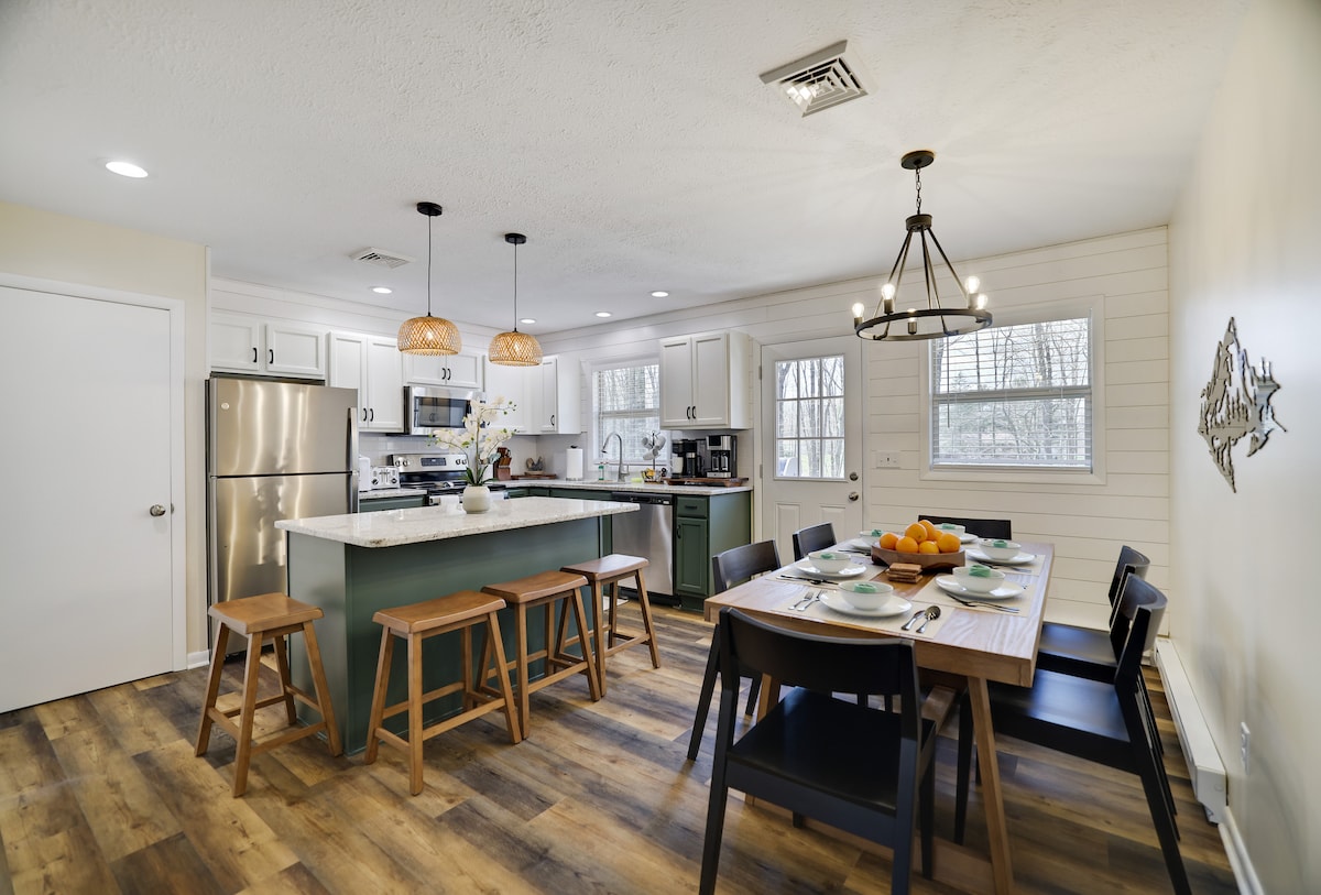 On cool Fall/Winter days delight in crispy fresh air of woods and visit our lake to fish /skate. Visit a close-by ski resorts and waterparks or stop by our indoor pool. Remember to take sleds to go down our community slope. Spend evening warming up at the fire-pit and improvising a homemade dinner and then reunite with the whole family or set for a romantic dinner on an oversized deck or in our cosy dining room.