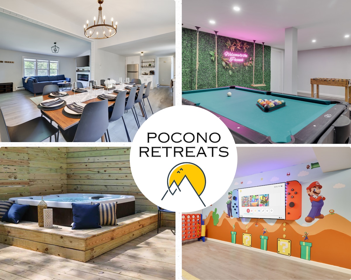 Escape to a cozy fall getaway near Kalahari, Mount Airy Casino, Crossings Outlets, Lake Wallenpaupack, & Tobyhanna State Park 2 miles away w/ fall foliage, & mountain air, lake views, wildlife, & picnic spots. Nestled off a rugged private road. This spa style retreat has a soaking tub, rain shower, smart lights, kitchen w/ smart stove, plush beds, LED mirrors w/ music sync, & retro arcade fun. Perfect for couples, birthday getaways or families seeking a peaceful Poconos stay w/ modern amenities.