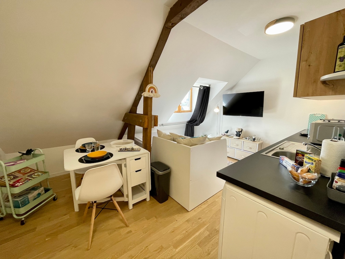 Le gîte refait à neuf. Une chambre avec lit double 160, 2 lits jumeaux en mezzanine. Une kitchenette , un espace repas, un espace salon et une salle d'eau. Espace de stationnement privé. Equipements : produits première nécessité dans la cuisine, bouilloire, cafetière piston, cafetière Malongo avec dosettes, thés. Ventilateur, lave linge. Logement situé au 1er étage OPTIONNEL: Draps : 10€ par lit Linge de toilette : 5€ par personne