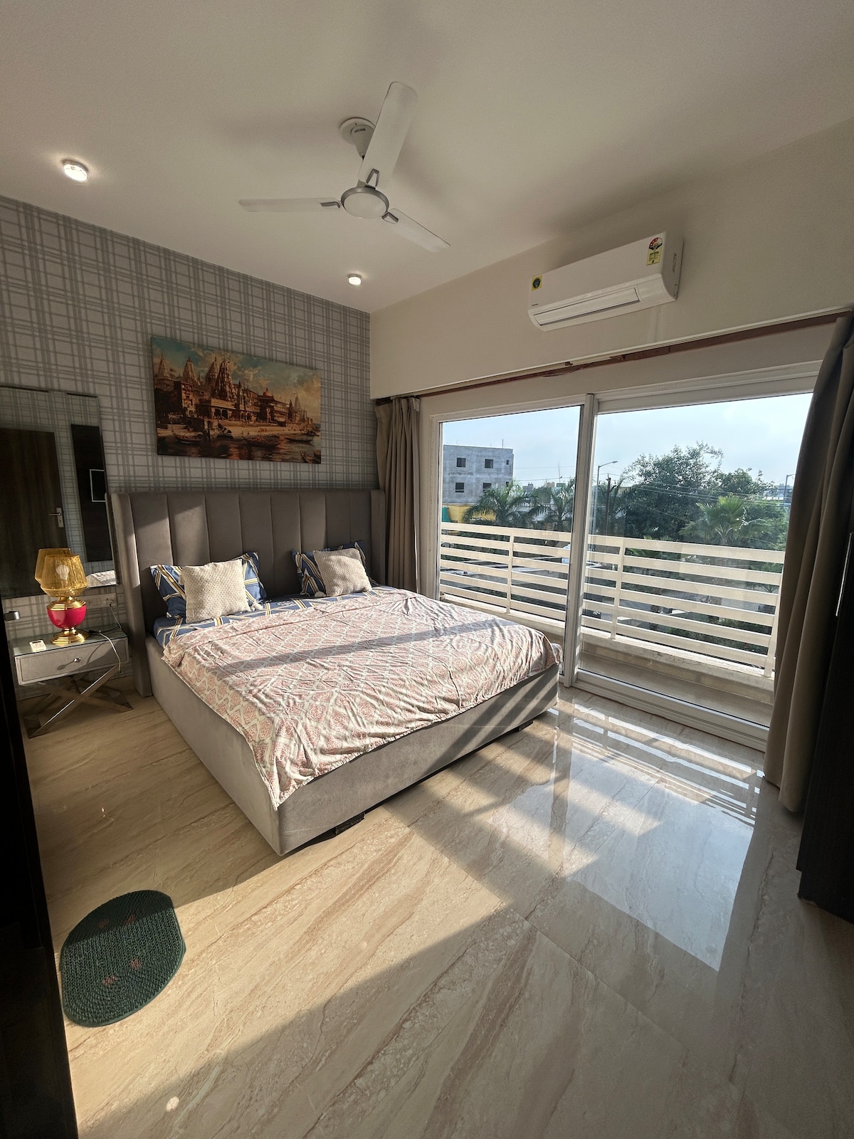 Vrindavan's Stunning Luxurious Suite - tasteful colors, corners & more 📍 Prime Location: ✔ Prem Mandir – 3 km (10 min) ✔ ISKCON Temple – 3.5 km (12 min) ✔ Banke Bihari Temple – 4 km (15 min) ✨ Why Stay Here? ✔ Luxurious box-style bed for ultimate comfort ✔ Inspired by Rajasthan’s folklore & vibrant culture ✔ 24x7 Lift | High-Speed WiFi | Fully Stocked Amenities Discover a unique blend of urban luxury and Indian heritage in this 11th-floor designer suite with breathtaking views. Welcome Home!