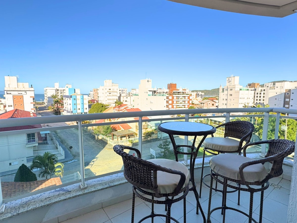 Apartamento com linda vista de Bombinhas, Bombas e Porto Belo. Apto de 1 quarto (casal - cama queen size), cozinha completa, banheiro, sala e sacada c/rede. Moderno, decoração clean, ar condicionado e TV led. A propriedade possui pátio, piscina, churrasqueiras e há 1 vaga de estacionamento (compartilhados). Ficamos 5min a pé das praias: Lagoinha, Sepultura e Retiro dos Padres, zona tranquila e segura, 15 min a pé do centro de Bombinhas. Acesso a cobertura por escadas.