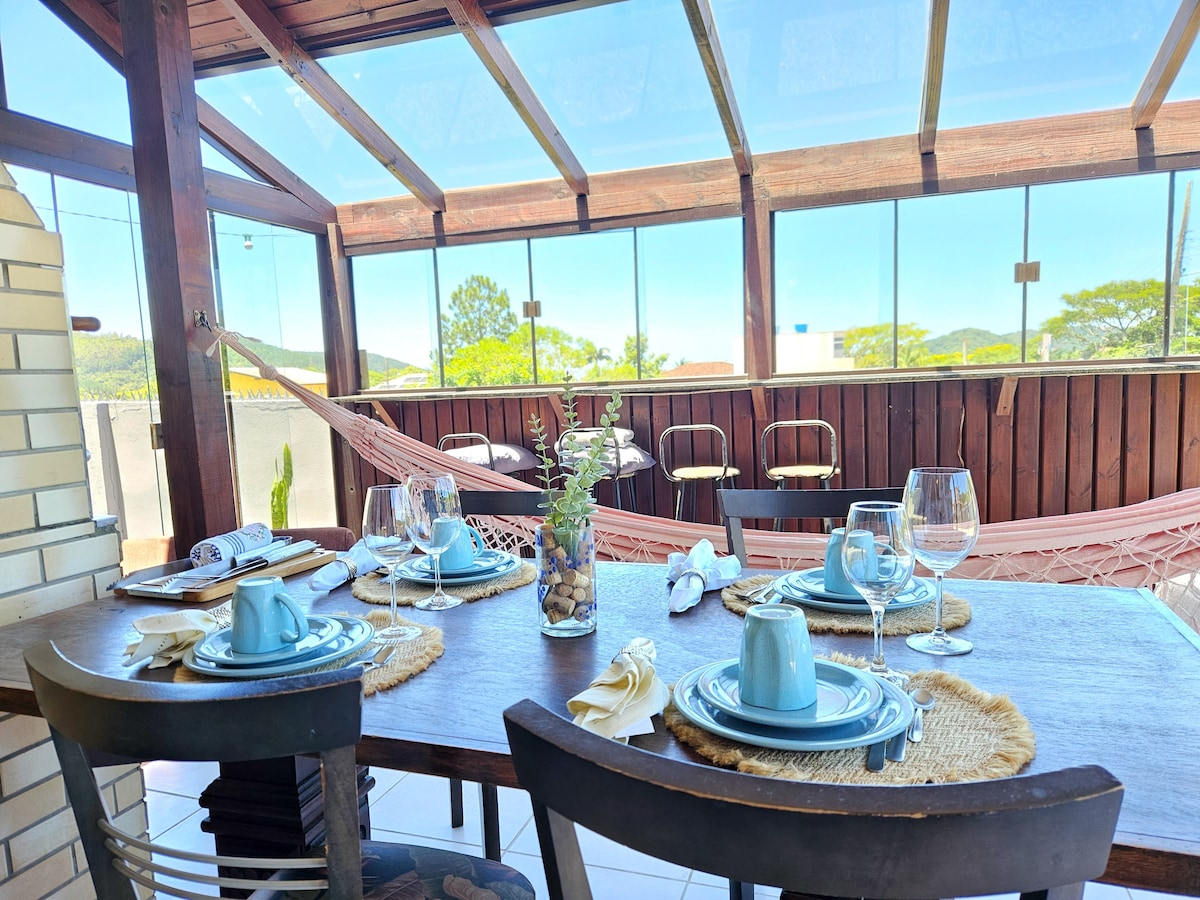 Casa localizada em rua sem saída, tranquila, com uma vista incrível para a Baía dos Ganchos. Acomoda até 8 pessoas, com 2 quartos: ambos com cama de casal e ar cond. A sala oferece uma cama de casal e ar condicionado. disponibilizamos também 2 colchões de solteiro. A cozinha é totalmente equipada. Na parte de trás, você encontra uma área de churrasqueira completa, com mesas, cadeiras e utensílios. A sacada da casa, equipada com redes, oferece o local perfeito. lavanderia com máquina de lavar.