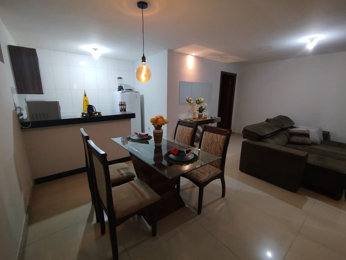 Endereço: Av. Bruno Chaves 100, Morada do Acampamento. Flat recém reformado perto do gv shopping, 2 quartos, ar split em todos os quartos, cozinha americana completa, garagem, internet de alta velocidade, varanda, elevador, smart tv (na sala e suíte)e lavadora de roupas. Todas as despesas já inclusas no valor da reserva. Localização excelente na área central a poucos metros do shopping e comércio do centro.