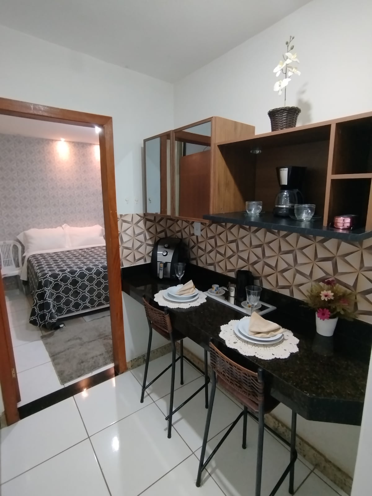 Espaço amplo e elegante, perfeito para quem busca praticidade e conforto. Composto por uma suíte completa com ar condicionado, sala grande com TV de 55", Wi-Fi, cozinha equipada, e home office. Fácil acesso ao portão de entrada, à lavanderia e àrea de fumantes.