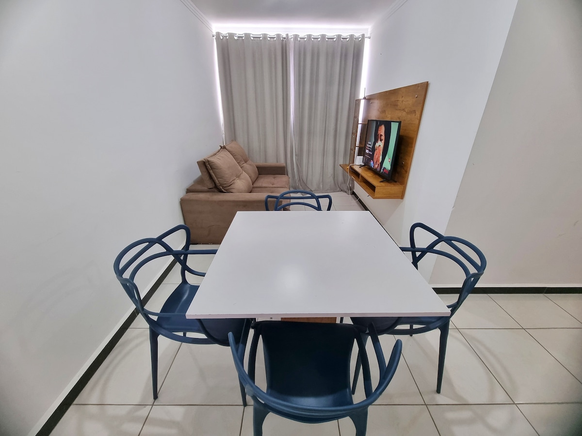Endereço: Av. Bruno Chaves 100, Morada do Acampamento. Flat pertinho do GV Shopping. 2 quartos (1 suíte), ar split em todos os quartos, internet, tv na sala e suíte, lavadora, cozinha completa, sacada na sala e quarto, elevador e 1 vaga de garagem para veículos de pequeno ou médio porte. Localização excelente com acesso fácil e rápido aos principais pontos da cidade. Distâncias: GV Shopping - 500 m Comércio Centro - 650 m Praça Serra Lima - 1 km Rodoviária - 1,1 km Unimed - 1,3 km