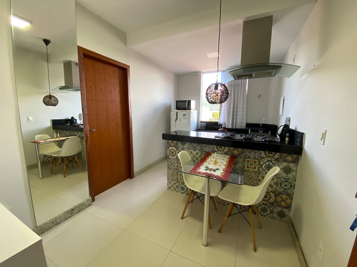 Flat confortável com acabamento moderno, ideal para quem busca sentir-se em casa! Dispõe de vista privilegiada para o ponto turístico da cidade: Pico da Ibituruna, com direito a sacada, vaga de garagem, cozinha completa com todos os utensílios (microondas, panelas, pratos, copos, taças, talheres, misteira, potes), smart TV. Quarto com A/C Split, possui escrivaninha dobrável, cama queen com colchão Ortobom D33, roupeiro espaçoso. Iluminação confortável, flat bem arejado e com ótima ventilação.