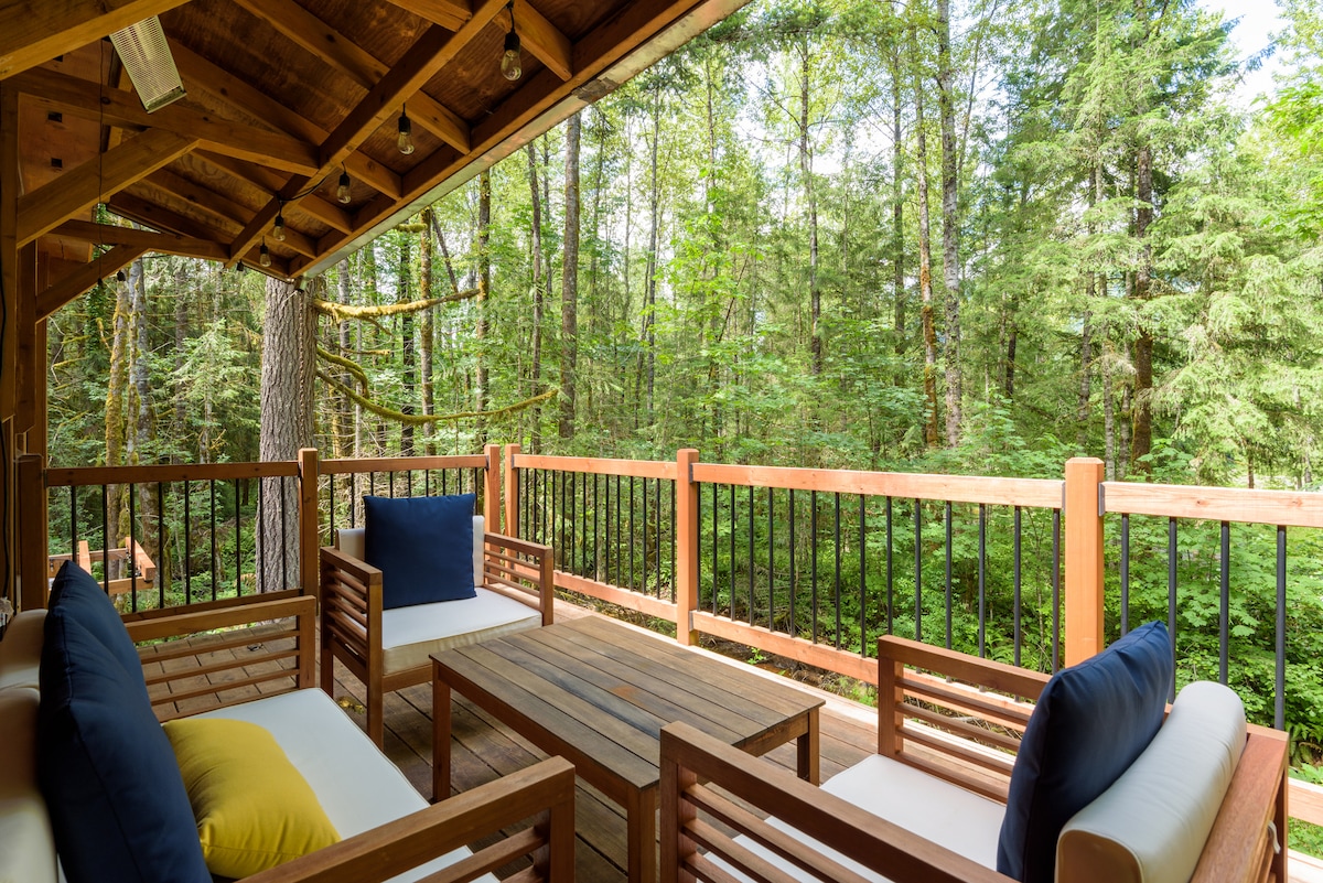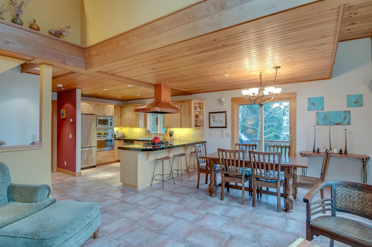 Our Mt. Hood chalet has stunning architecture, is located off a quiet road, and backs to a vast and private forest with a private trail to Welches creek. Enjoy multiple indoor levels and explore outdoor decks and beautiful terraced garden spaces and soak in the Oregon Hot Springs hot tub. The home is equipped with fast Wi-Fi and streaming. We’re experienced and responsive hosts that are happy to help make the most your visit, check out our local guide for our favorite restaurants and hikes.