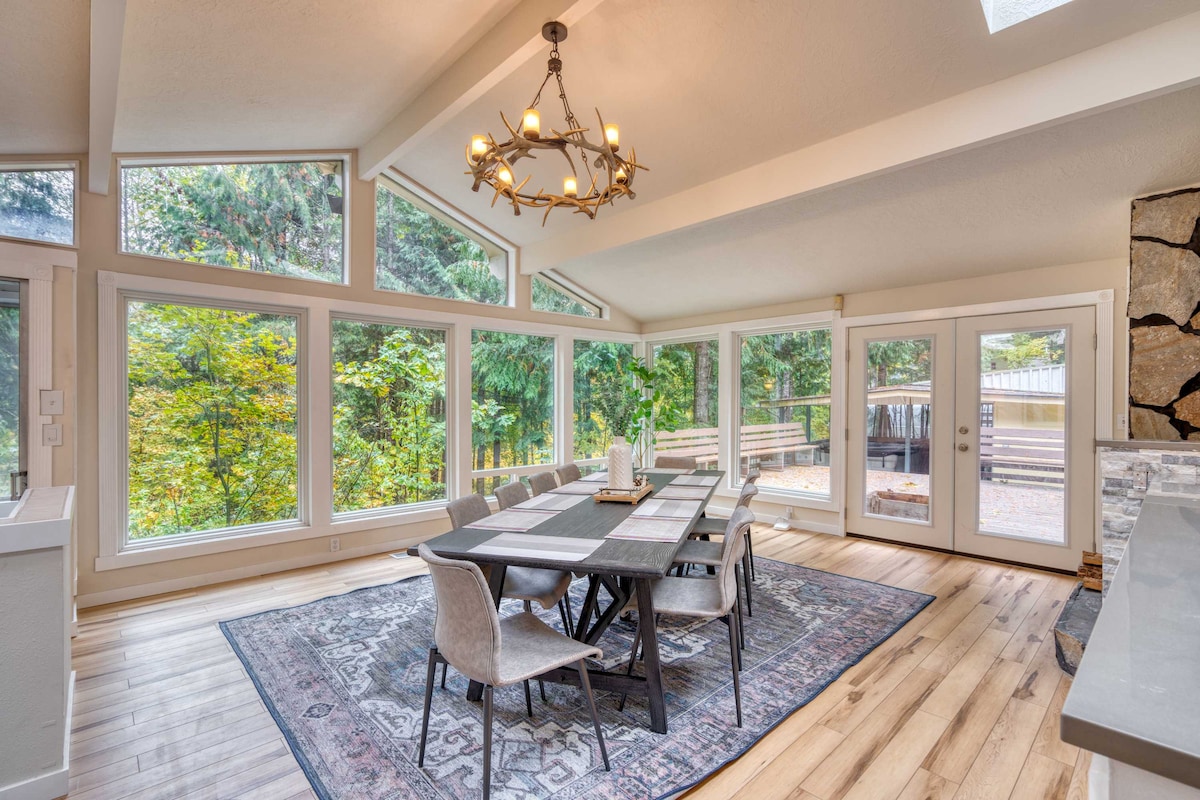 Surrounded by the massive evergreens of Mt. Hood National Forest, the newly renovated Hood Mountain Lodge is your basecamp for endless outdoor adventure or a peaceful enclave for a mountain get-away. Soak in the forest sounds on the expansive wrap-around deck. Cook a gourmet meal in the chef's kitchen. Or enjoy a glass of wine and soak in the hot tub or steam in the sauna. The choices are endless for outdoor adventure at your doorstep and indoor luxury after a fun-packed day.