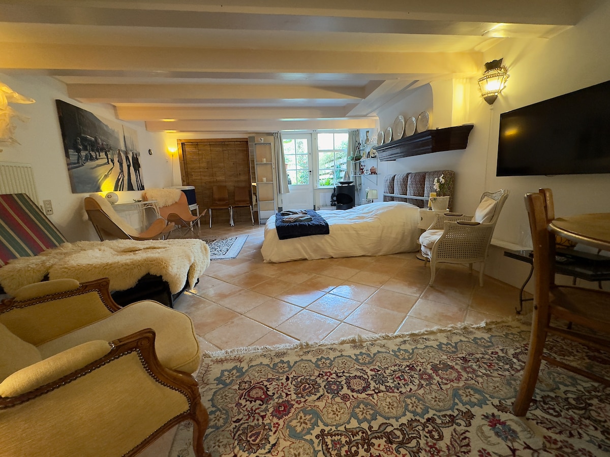 This beautiful little cottage is in the garden of the owners and is a total private oases just for you! It has a large sofa/bed for 2 people and a private entrance. It includes a private bathroom and toilet and a private kitchen. There will be NO sharing anything with the owners accept the driveway. You have your own private terrace outside where you can enjoy the sun and have breakfast or a nice evening dinner.