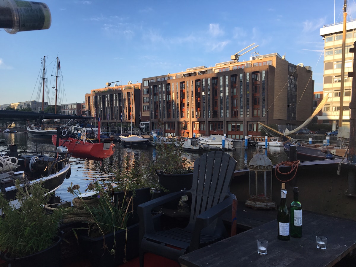 Independent B&B on our houseboat with your own entrance. We are located on a sunny and quiet canal in the heart of Amsterdam, close to Centraal Station, Anne Frank House, The Jordaan and the Canals. Your space is totally private with your own bathroom, bedroom, captain's room and wheel house. The space is centrally heated and double glazed for chilly days. You also have access to outside space on our pier where you can relax into the evening on warm summer nights.