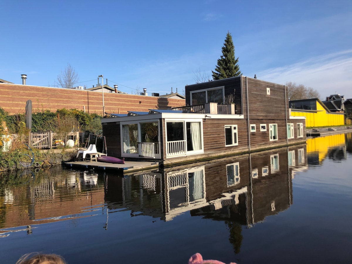 Come and stay in a houseboat! We offer a private guesthouse with large dining / living room (including comfy bedsofa for 2) and separate toilet upstairs. Downstairs a queensize bed overlooking the water and bathroom with shower & large bath. A terrace in front with several seatings and a swing bench. Located in a beautiful green street very near the center: 2 stops by tram or 15 min walk from central station. We don't serve breakfast but provide many nice basics to prepare your own.