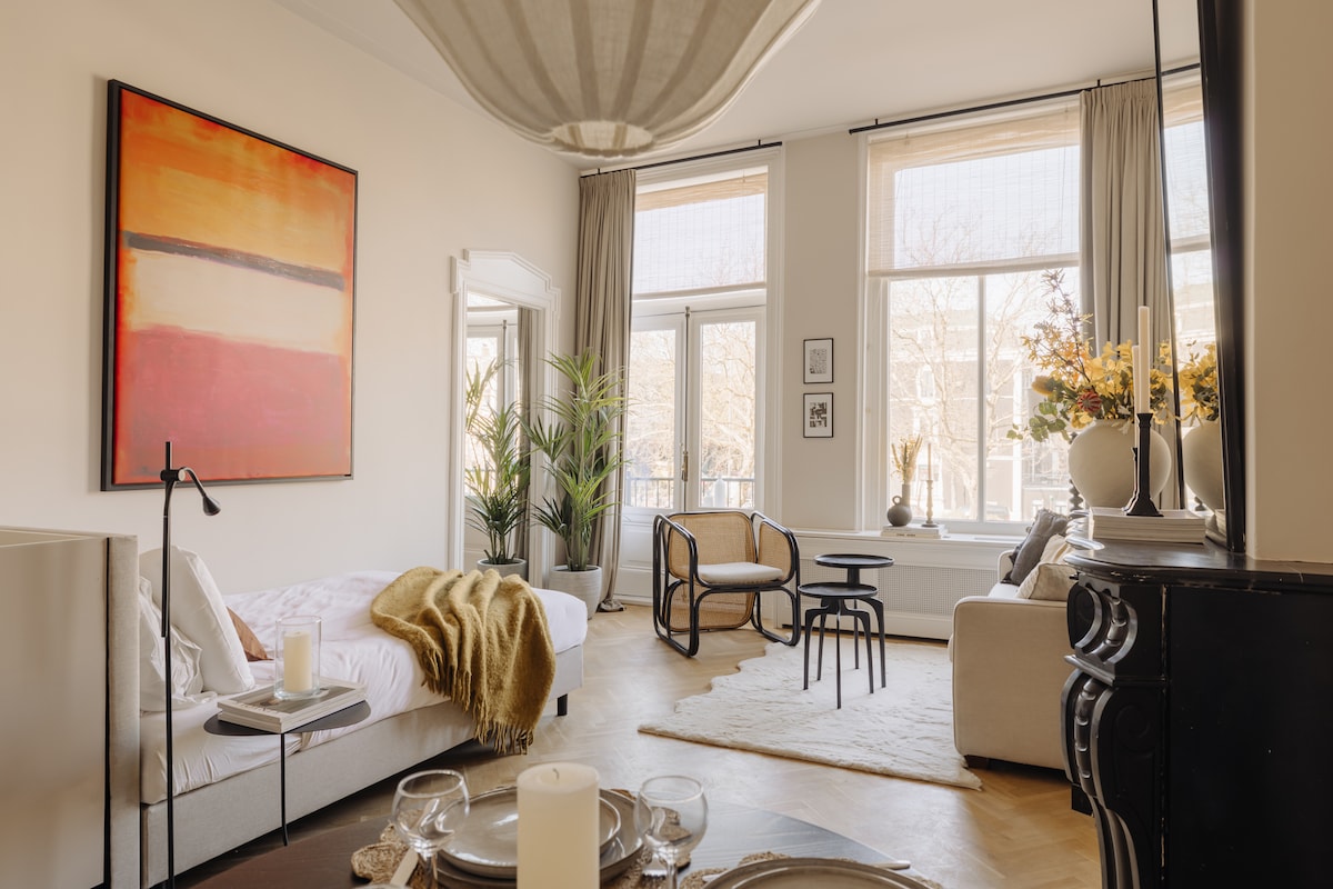 Private ground floor mid-century/modern designed cosy studio apartment with luxury details, as part of our larger home. Museum Square around the corner with all museums, the famous Albert Cuyp fresh market and diverse restaurants and breakfast/lunch/dinner cafes within minutes walk. The best our city center has to offer! ・ Best suited for 2 guests ・ You can book 3 months in advanced ・ Incl. fridge, kitchenware etc, but no full kitchen (no e.g. microwave) ・ Find our city tips in the Guidebook