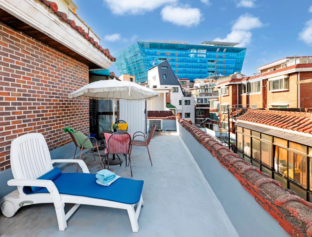 免费停车#独享#私人屋顶&可举办通宵派对,8分钟到弘大入口站,屋顶