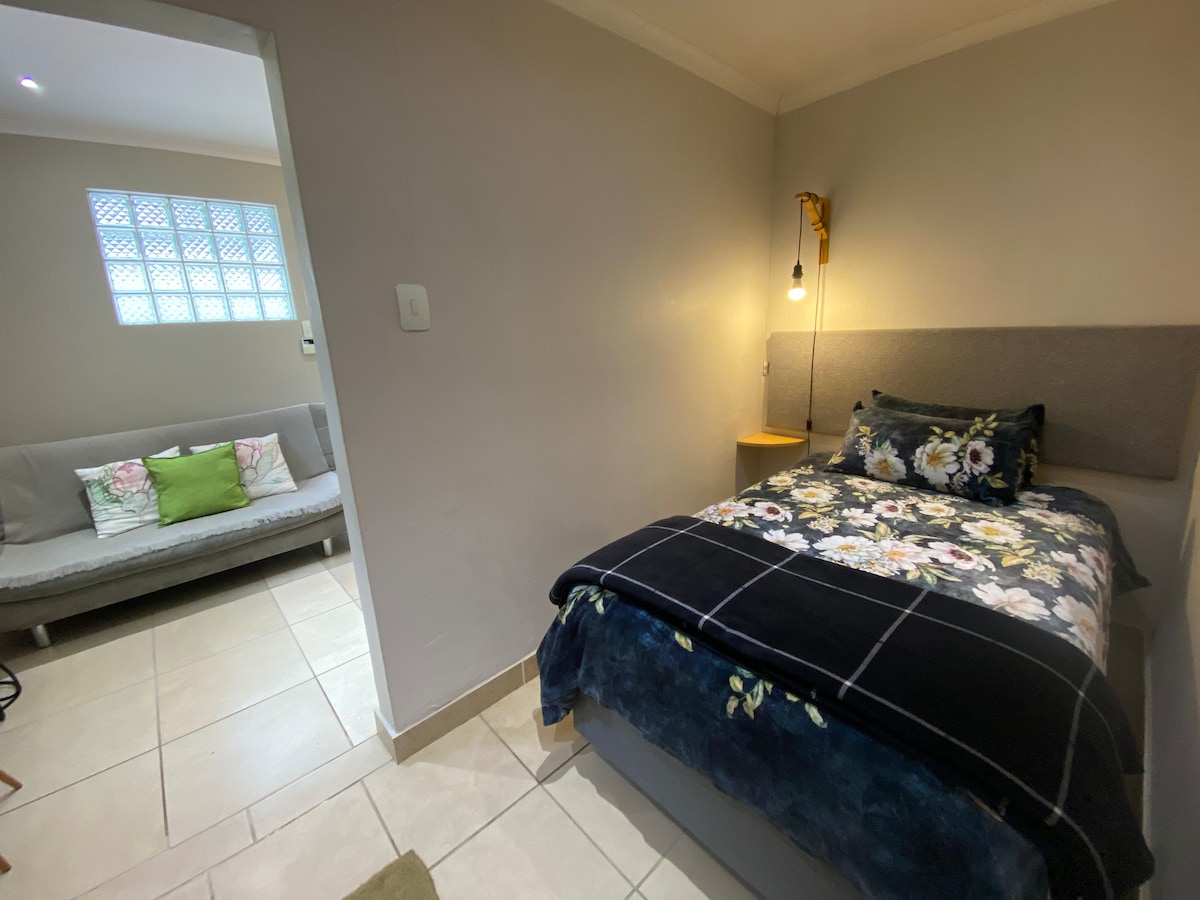 A one bedroom, self-catering and self-service cottage in the leafy suburb of Mount Pleasant. The unit is free standing next to our home with your own separate entrance to come and go as you please. Spacious and secure offstreet undercover parking with remote access. The open plan living space includes a lounge area with smart TV (Netflix and OVHD decoder) and a dining/workspace area. The kitchenette is fully equipped and includes a fridge, mini oven with two plate stove and a microwave.