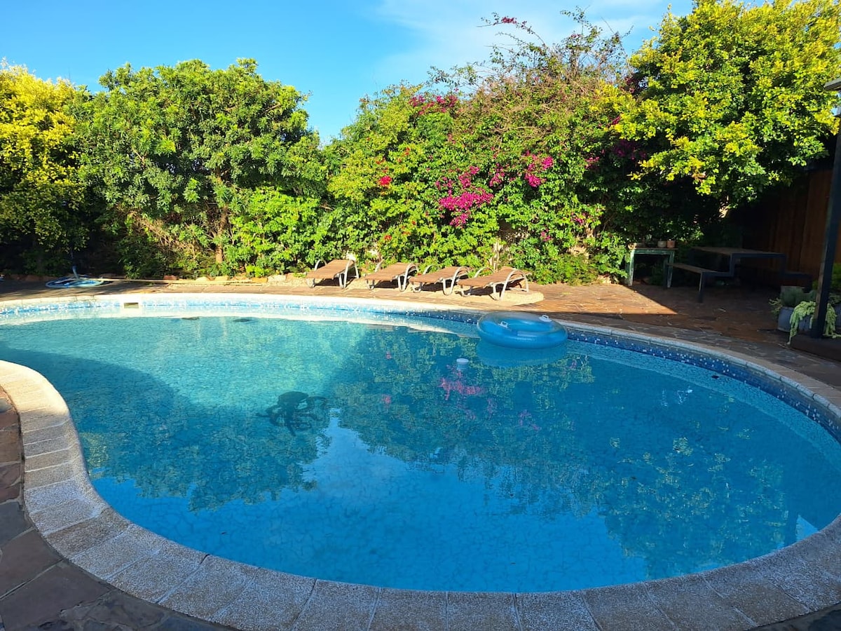 Experience the perfect blend of nature and comfort with your own swimming pool at our small family farm. You'll be surrounded by wild peacocks, free-range chickens and donkeys. Plus: - FREE 28-Page Garden Route Travel Guide - When you book with us, you’ll receive our exclusive Travel Guide full of hidden gems, activities, national parks, and extra safety and travel tips for your journey. - Homemade Breakfast Incl. - 2min Drive to 1# ranked Beach in Town - 1min Drive to Golf Club with Zebra's