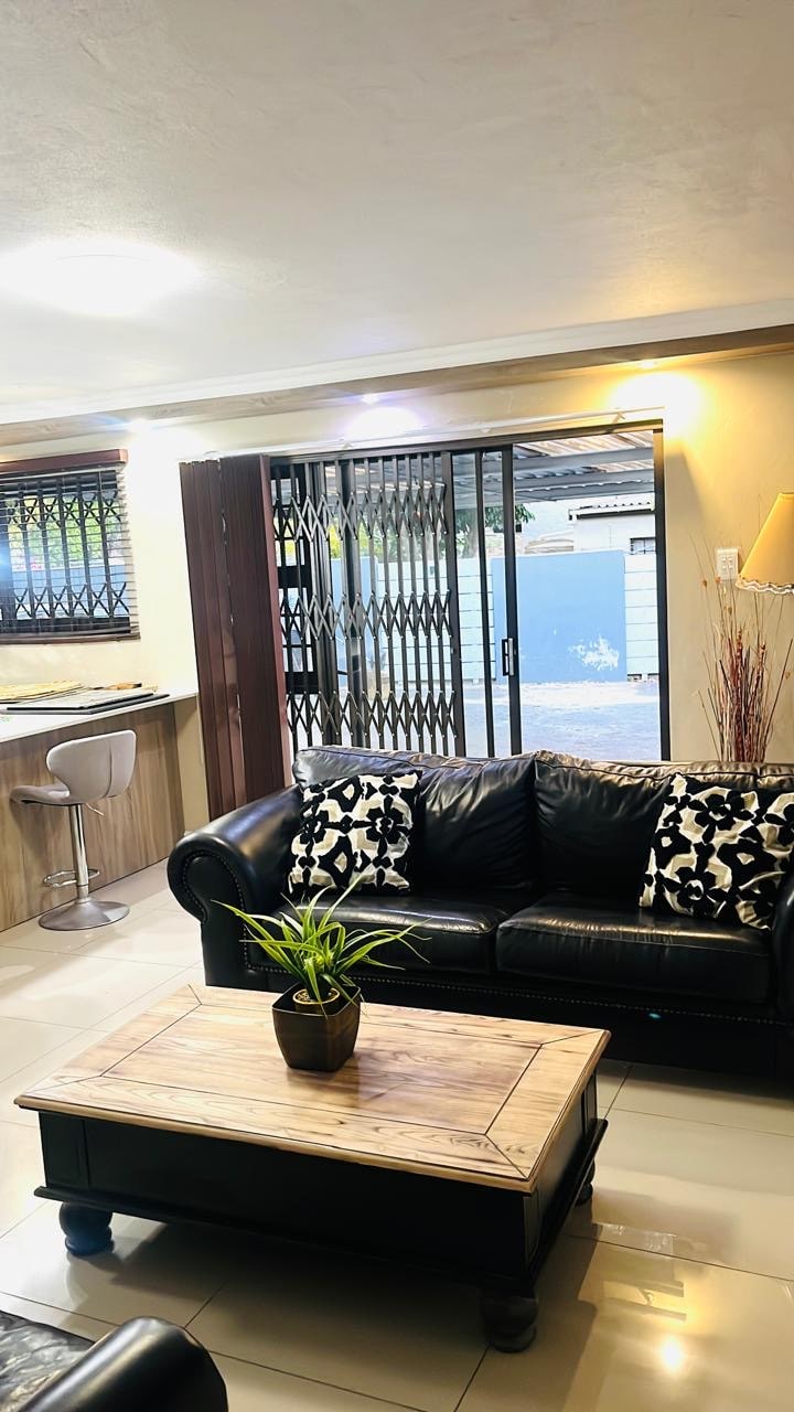 A very comfortable and practical space for the weary traveler. Located in a quiet family suburb close to the airport, and less than 1 km from a large shopping Centre. We are within walking distance of several fast food outlets, Spar and Checkers. Relax and lounge in front of on comfy couches and have a restful nights sleep in one of two comfortable queen-sized beds. For the traveling executive there is a suitable work station that allows you to be productive while you travel.