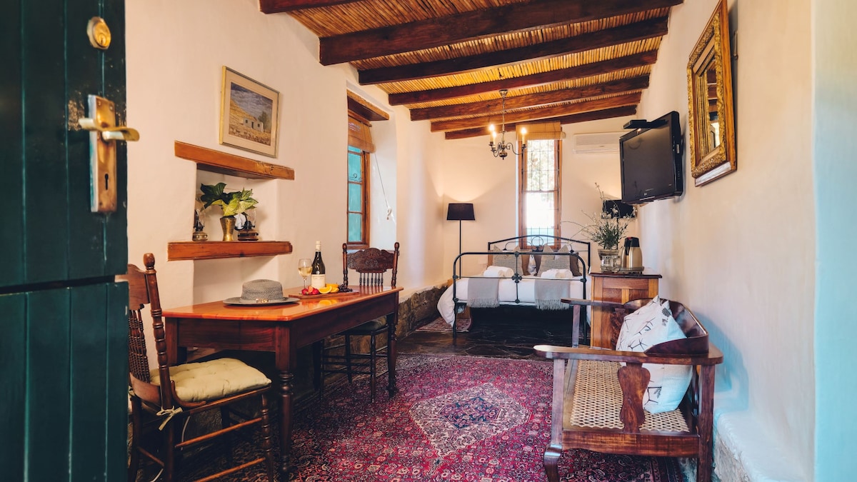 The Old Wagon Shed, adjoins a lovingly restored 1780's home. Enjoy quiet comfort, linger in the shaded garden beneath elegant cypress trees and end the day with a relaxed braai beneath the endless Karoo sky — a sanctuary where history and ease meet.