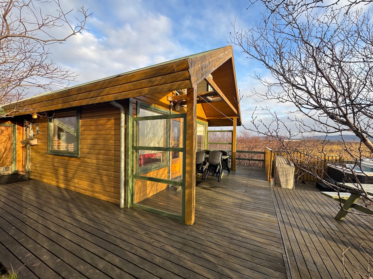 Wooden, warm house for six people. Perfectly integrated into the lava field at the foot of the extinct GRABROK volcano, which you can enter almost straight from home :). Beautiful views and silence. Only the sounds of nature can be heard. An ideal place to observe the northern lights (no city lights). Just 300 meters from the main road No. 1. Fully equipped kitchen. Perfectly clean drinking water flows from the tap. The jacuzzi is already working :) There are bubbles and it's nice :) !!!