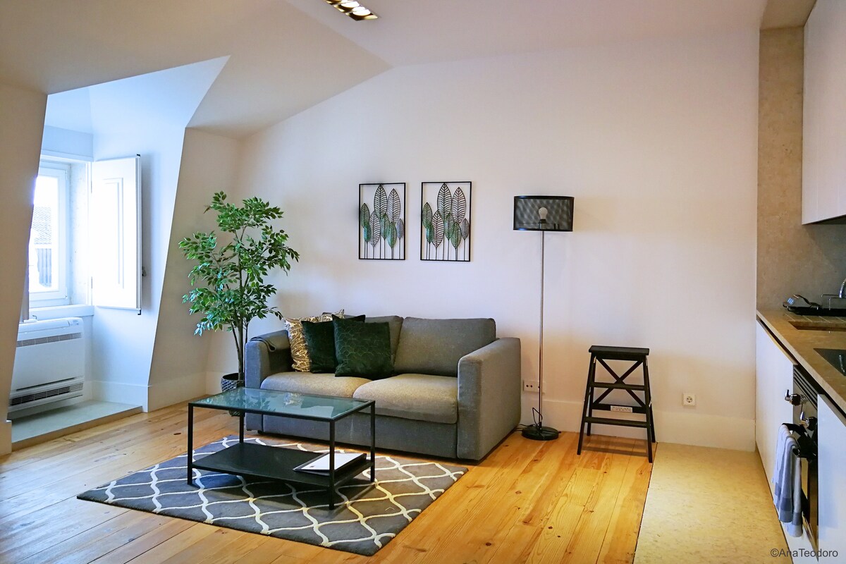 Apartment in the heart of Lisbon. This one-bedroom apartment with a sofa bed features a double bed, a bathroom, and a fully equipped kitchen with a refrigerator and a washer/dryer. The living room opens onto balconies with a table and two chairs for outdoor use. Located just a few steps from historic cafés, traditional shops, iconic trams, and the Tagus River, it is the ideal starting point to explore Lisbon.