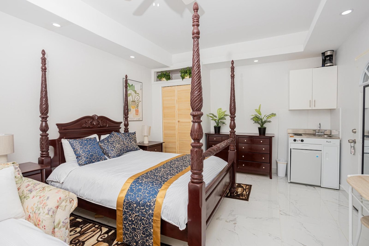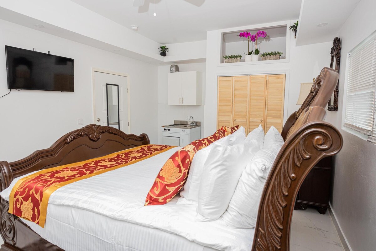 Ports of Call Resort is the most affordable boutique resort in the Turks and Caicos Islands. It is within walking distance of many restaurants, dining, family-friendly activities, nightlife, and what many have named as the #1 beach in the world, Grace Bay Beach. You’ll love our hotel because of the complimentary continental breakfast, area, comfy beds, variety of amenities, and the cosiness. This one bedroom apartment is great for couples, and solo/business travellers.