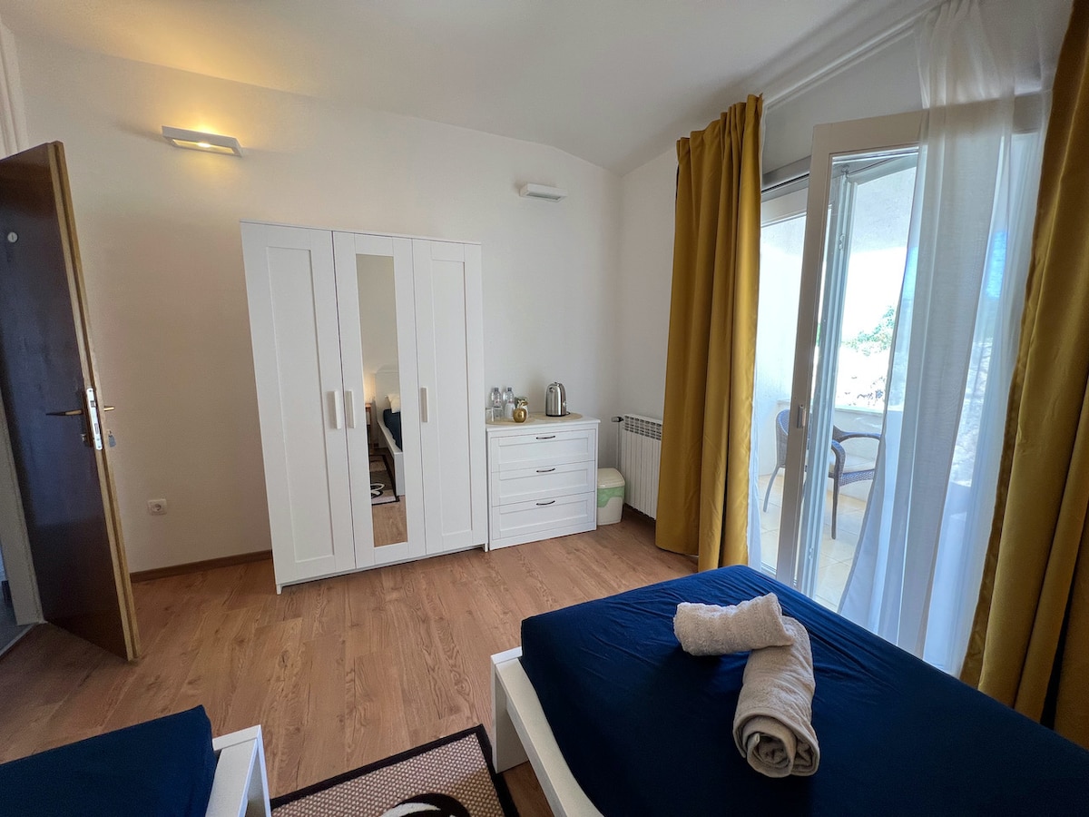Apartments Nadia are located on the first floor of a family house. Fully furnished apartment offers you all comfort for a pleasant stay. You can enjoy your private large terrace with sun loungers, and table with chairs for your seaview meals. There is an olive grove around the house where your children can play and a barbecue for shared use. The beach is about 600m (air distance) from the house, with parking, natural surroundings and facilities. I look forward to welcoming you to my apartment!