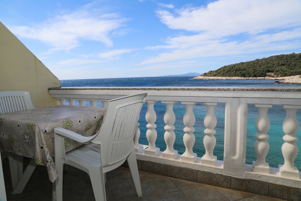 Only five meters from the sea with a great view on the sea, Milna cove and the sunsets. Parking, fully equipped kitchen, TV, air conditioner, balcony, WiFi... It is located in the quiet village Milna with 4 beautiful beaches and breathtaking nature. Queen sized bed. Our best selling apartment.