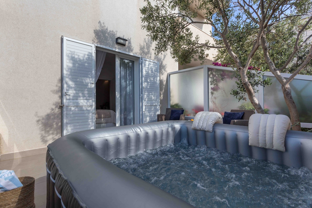 Relax and enjoy your stay @ Casa Benita Hvar, a guesthouse designed for relaxed, modern island living. Step outside onto your private terrace, featuring a jacuzzi, cozy lounge sofa, Mediterranean plants and a outdoor kitchen — perfect for preparing simple meals or snacks during your stay. Whether you want to soak in the hot tub, unwind with a book or sip a drink in the fresh air, this space is all yours Each morning, enjoy a fresh, light breakfast delivered to your room—INCLUDED in the price