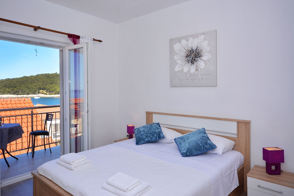 Located in a quiet part of the town of Hvar,700 meters from the town center and 600 meters from the largest local pebble beach 'Pokonji Dol'. The apartment is completely new.the apartment has a living area of 55m2. Modern and luxuriously furnished. the spacious balcony offers a fantastic view to the Adriatic sea and a beautiful group of 'Paklinski Islands' Far enough from town centre for relaxed vacations and yet minutes - close to all the fun and joy of the Hvar town.
