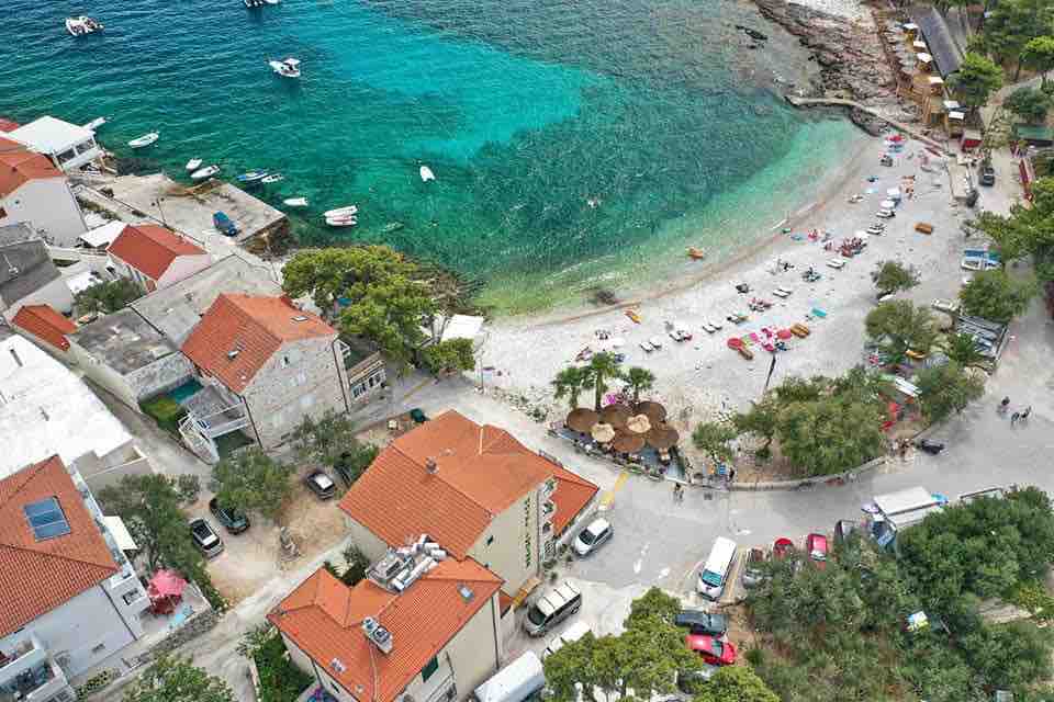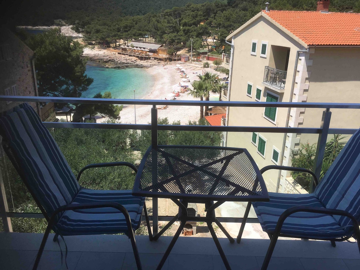 Only five meters from the sea with a great view on the sea, Milna cove and the sunsets. Parking, fully equipped kitchen, TV, air conditioner, balcony, WiFi... It is located in the quiet village Milna with 4 beautiful beaches and breathtaking nature. Queen sized bed. Our best selling apartment.