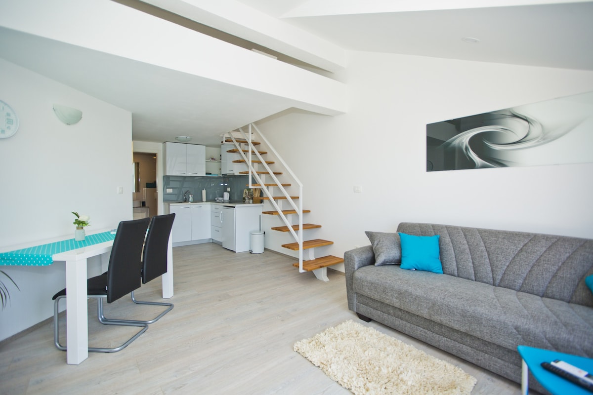 Apartman je na odličnoj lokaciji u obiteljskoj kući u mirnom kvartu i svega 5 minuta šetnje do samog centra grada. Svi apartmani se čiste i dezinficiraju po preporukama airbnba Apartman ima 45 m2 i prostranu terasu od 15 m2. Ispred apartmana je vrtni kamin i veliko parkiralište u dvorištu kuće. Plaža je udaljena 50 m. U blizini su restorani i kafići. Mjesto za iznajmljivanje skutera,auta i brodova je udaljeno 70 m. Igralište za interakciju je u krugu od 100m. luka 200m od kuće Supermarket 100 m.